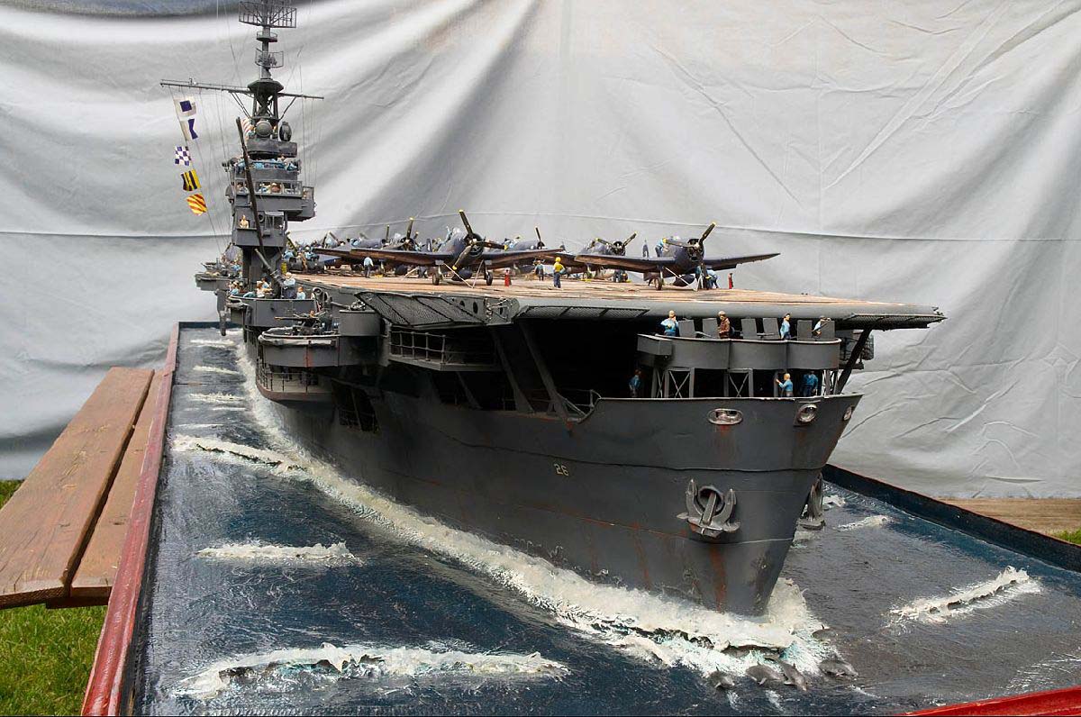 I still had the plan to build an Essex-class carrier and as soon as I started the pre-planning stage of this model, it became clear to me that not only the size of this model would be overwhelming but most of all, all those tiny details which had to be made. So I took another look at different aircraft-carrier-classes and there was the answer to all my problems! During all the years I had simply never thought about the idea of an escort-carrier. This was nothing unusual, cause almost all books, seem to ignore the fact that there was something like escort carriers. This is even more convincing due to the fact that there were more escort carriers build during WWII, than all large “fleet-carriers” of all nations combined from the very first crude designs until the current classes of Super-carriers! No wonder I did not knew very much about them too. But here it was and the idea of building something like an escort-carrier became even more interesting, cause as a model-builder I always preferred the somewhat unusual and less known. The only problem was the fact that there really was nothing more detailed available about all those ships. This was a major problem for me, cause without any plans and photos it is at least very hard, if not impossible to build something like that. But during my research I found not only plans, I even got in contact with the so-called “ECSAA”, the Escort-Carrier, Sailor and Airmen Association. Sure enough they even had a website with lots of email addresses and so I decided to give it a try. At this time I had been able to obtain some plans of the Sangamon-class and one of those addresses got my in contact with Hank Milian.