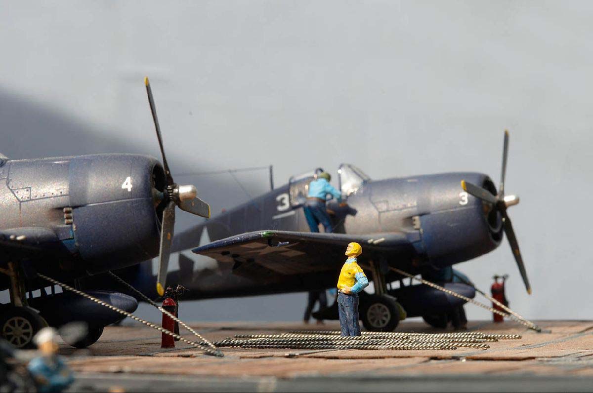 The island of the ship is a project for itself and could easily be used as a single part for a diorama. Fortunately I had several pictures of the island so the construction of this part went pretty fast and without any major problem. The whole structure was once again made of plastic sheet. The only exception to other parts of the ship, except those which were already finished, was the fact that I had to add all the details to this part at this stage. So all tiny parts had to be made and installed to their appropriate places. One problem came up when I started the construction of the radar antennae’s. There were not very good pictures available were I could see which antennae’s were installed in early 1945 but once again I had the luck that I only had to contact Don Schroeder about this problem and within hours he was in contact to former radar operators on the Sangamon. According to the plans which I had, Sangamon should have carried SK, SG, and YE but even on those photos which were not that good in their quality it was clear that Sangamon did not carry SK but the much smaller SC-2 and on a different position than in the plan as well. Referring to some books no Sangamon –class-carrier had the SK Radar installed at any time. So at the end we had figured out where which antenna it had been but there still was the problem that on one photo it seemed that there was another antenna, which I could not identify. Finally and with some help from old friends we were able to identify this mysterious radar as a SP Radar, with a so called 6 ft. cut antenna. Normally this radar had a round dish but the strange shape on those photos came from a rectangular radar dish, so finally we had the solution. SP was a fighter director antenna, which was used by the Sangamon, cause during her last major overhaul in Bremerton she was designated as a night-fighter-escort-carrier, the first CVE which was used in this role. Therefore they needed the additional SP radar. The open bridge received all the details which were needed, steering wheel, engine annunciator, capstan, small windows at the front, captain’s chair and so on. The same was for the primary flight control on the same deck level but on the port side. One deck below, the admiral had his own little bridge. The lookout level received several “big eyes” and some signal lights as well. The next level is for the much bigger search lights and the first of the radars, in this case SP. The little mast was made of plastic sheet parts again but here I used some PE parts as well for the floor. The yardarm and some other small details were made from wood, mostly because they are simply stronger and later the small lines can be stretched better. Several details more were added and finally the whole island was coloured and slightly weathered. For colouring I used WEM colours, which were readily available in the right colour code. In 1945 Sangamon was wearing the so called Scheme 21, which consisted of 2 colours, mainly a dark-blue-grey. At last the rigging was done by using a slightly stretchable thread. After that the whole Island was stored inside a wooden box until it could later be fixed to the rest of the ship. Next I turned my attention to the Gallery Deck once again. On that deck I had to do the final detailing. Myriads of tiny parts had to be made and found the final place along that deck on both sides of the ship. Ladders, fire extinguishers, fire axes, fire hoses, tow bars and several other parts had to be added. This work alone took several weeks to accomplish. Finally I was able to start the work on the armament itself. For all those guns I used R-H Fittings which purchased from several sources. These tiny models are not bad at all, but neither are they in a quality I would like. So I decided to give them some more details. In case of the 20mm Oerlikon I made several PE parts by myself and replaced the gun shield, the gun sight and added additional shoulder rests and straps as well as a few other details. The 40mm Bofors received new gun sights as well and new railings on the back side of them. Some cooling hoses for the gun barrels and few other details enhanced those guns much more.. The 5inch guns were mostly build by myself using different materials and various parts from other models. Another detail for those Catwalks was the so called floater nets and baskets. These were made of self made PE parts again. The floater themselves were simply made by using small pearls from a kids toy. (My daughter gave them to me unselfishly) These pearls were put on a thin thread and coloured. As soon as all the guns were put in their places alongside the flight deck, I could start the next part of the model. This time I turned my attention to the aircrafts and the rest of the flight deck equipment. Building those aircrafts was not a real problem to me. First of all I’m specialized on aircraft models since many, many years. So the original idea for this carrier model came from the fact that I always had build aircraft models in this scale and I always wanted to build an aircraft carrier in the same scale as my aircraft models. In March 1945 the aircraft contingent of the Sangamon consisted mainly of F6F Hellcats and a few TBF/TBM Avengers. For the Hellcat I took the Italeri kit, which is pretty good detailed and has so far no major fault. The only problem with this kit is that somehow Italeri made a mistake with the engine. The push rods are on the back side, but fortunately this is something which can be pretty easily corrected. The cockpit interior received some self made detail-parts for a better look; cause in most cases the canopy will open and one can easily look inside. Some harness was added as well. I used the Night Fighter F6F-5N version as well as the normal F6F-5. Since Italeri did not add a drop tank for their night fighter kit I had to make them too. Some of the F6F-5 were the “E” version which used a separate radar pod on the starboar