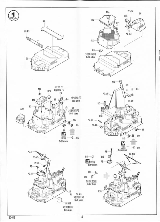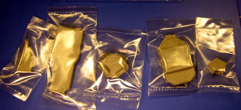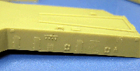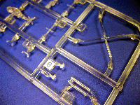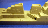This combination of 5 "sprues" consist of the main superstructure, stack and bridge pieces. All are well detailed, and fit together will. "E2" shows some slight damage where the bulkheads fares into the hull, but this will rectify itself during final assembly. |