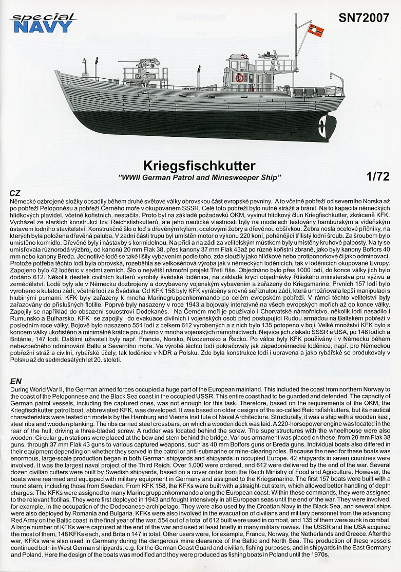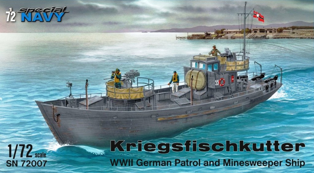 This Special Navy's 1:72 Kriegsfischkutter WW2 German Patrol and Minesweeper Ship, kit number SPN72007. It retails for $92.99 USD, and is available through Squadron Hobbies, who I'd like to thank for this review sample. |