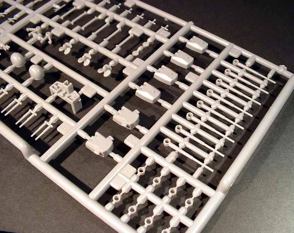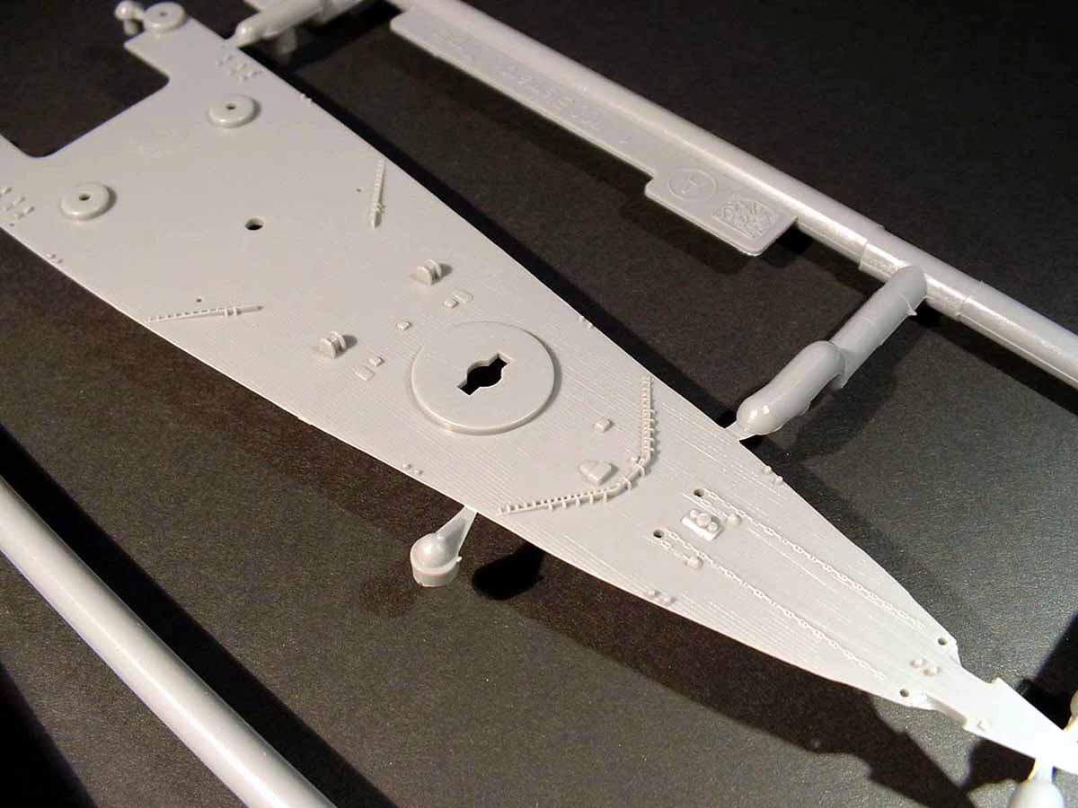 The top part of the armoured commandbrigde, the hangars and the funnel is in soft vinyl. I suspect that this is because it is easier to make detailed parts and get the parts out of the mold without destroying them when either the part or the mold is soft. Resin-kits are easier to make more detailed than injectionmolded kits because the mold is soft and flecible. In this case the parts are flexible and does not get broken when removed from the mold. Makes sense when you think of seams that will be hard to fix on these parts if they had been plastic and split in several parts. The downside is that it is very difficult if not impossible to modify these parts and that the parts might react unexpected to the individual gluetypes modelers are using. Also when the parts are painted the paint is more likely to break and come off when the parts are handeled too much. I think Dragon could have used a smarter breakdown of parts to solve this problem, but anyway. OK. The parts are detailed enough for me to stop whining about the choice of vinyl. Armament