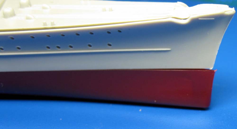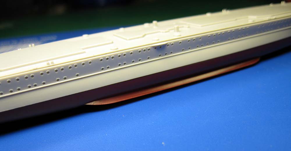 The deck comes in one piece, the length of the hull. It has good detail like staggered wood planking on the main decks, but some of the other fittings are soft, notably the anchor capstans. This deck fits pretty well length and beam-wise into the upper hull. |