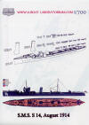 Laid down in March, 1912, S 14 was commissioned in November of the same year. While serving with the VII Torpedo Boat Flotilla, she sank in February, 1915, after suffering an internal explosion. For further information, check out the Wikipedia page for German World War I torpedo boats and destroyers here: https://en.wikipedia.org/wiki/German_ocean-going_torpedo_boats_and_destroyers_of_World_War_I |