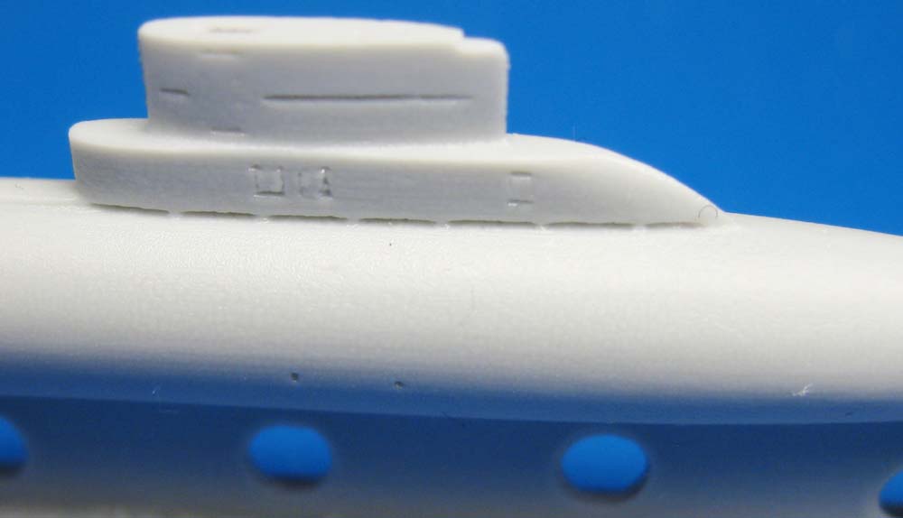 A standard OKB sub; single piece full hull, cast on a central sprue, and a separate resin prop hub. The hull of the sub has some slight machining/sanding artifacts, but some light sanding should smooth it out nicely. |