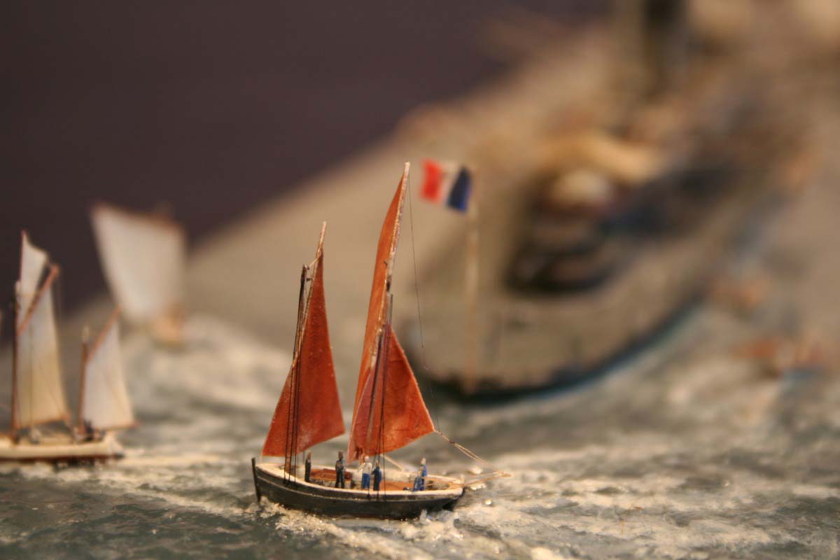 I was inspired by the lofty rigs of the ‘Bisquines’, a sailing trawler/dragger working the Oyster banks of the St.Malo bay . These operations required massive motive power-hence the vast sail areas. On regatta days they carried the additional top-gallant sails; the magnificent appearance of these tall, vast lug sailed rigs, on unstayed pole masts of diverging angles … was fascinating! A bit of research soon elicited a plethora of suitable background information as well as photos and plans. |