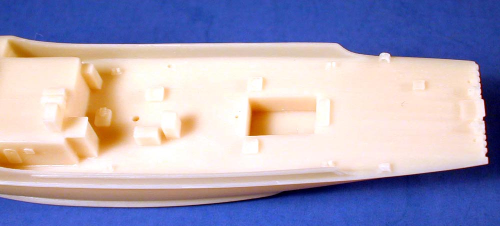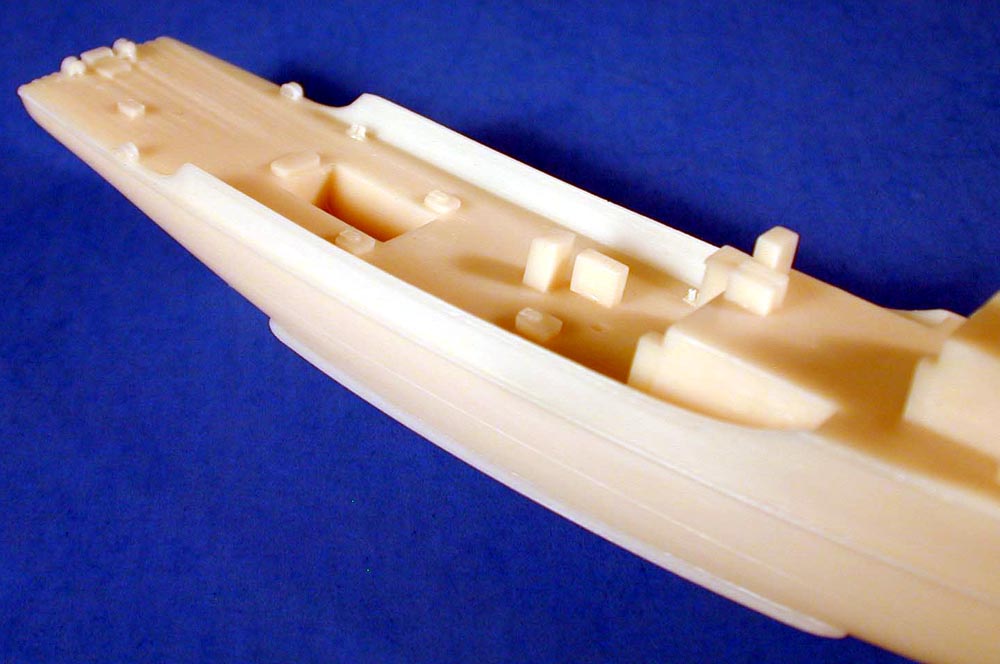 | The hull is cast in full hull style with all but the funnel in place. The casting is great, and there is lots of detail in all areas of the ship. The fore deck includes foot rails for the 20 mm mount, a seldom seen detail. The closed chocks around the hull even have the correct shape and just need drilled out. |