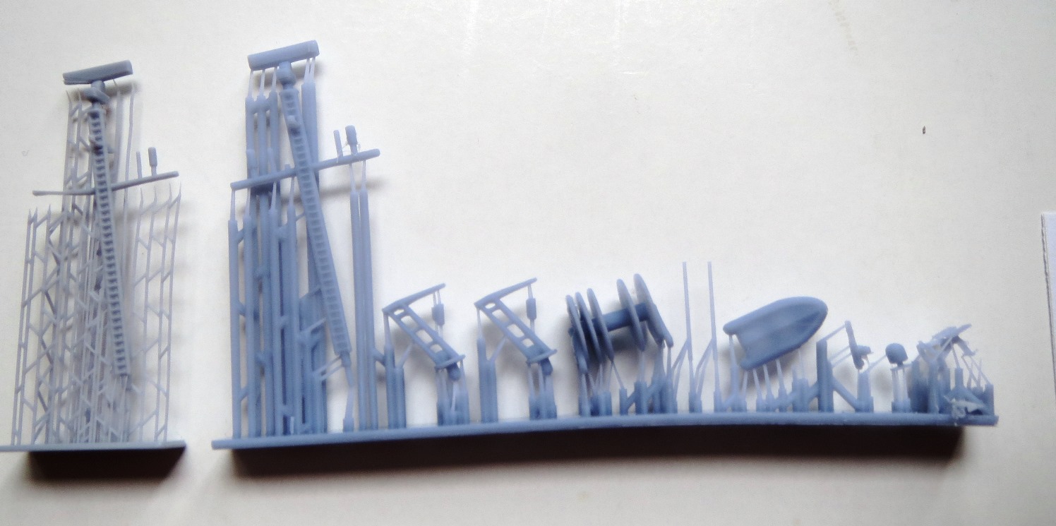 The first raft has several parts, including the mast complete with radar and other sensors on the yardarm, minesweeping paravane cranes, minesweeping winch drum, jack and ensign staffs, Zodiac raft, small radome and a twin 20mm gun. The 20mm gun comes in two parts, tripod base and shield and separate barrels. The mast on this raft is not well printed and clunky, but fret not! Realizing this, another mast is provided on its own raft which is much better as the rungs in the ladder are more defined. Unfortunately, the yardarm is slightly damaged. However, using the yardarm from the first mast can be used to replace the one on the other. The second raft has another pair of the paravane cranes that appear a little more refined than those on the fret described above. Also on this fret are a pair of rudders and propellers, a pair of lockers and another small radome. The latter appears to also be a better print of the one on the first fret. A couple of parts are missing from this fret and I am guessing they were another set of lockers. The third and fourth rafts are identical and contain large and small cable reels, another set of rudders and propellers, large and small minesweeping paravanes and anchors with anchor chains. One of the anchors broke off and is damaged, but should be able to be repaired. Another pair of identical rafts contain large and small signal lamps, life raft cannisters, floats, more lockers and mooring bumpers in two sizes. A lot of the parts broke off the raft but where loose in the zip lock bag. Finally, three nicely done twin 20mm Oerlikon guns are provided that are printed as one piece and much better than the one of the first fret. Only one is needed so you have extras in case of breakage or an addition to the spares box. An interesting addition are three rafts with printed railings. These are reminiscent of the old Heller kits which came with plastic railings that were overscale. These are not overscale and more 3D in appearance than flat photoetch versions. The railings have individual stanchions, which are not my favorite, but these may be easier to work with. If you prefer, photoetch railings are also provided and covered below. As mentioned above, a nice base with two pedestals that are also 3D printed are provided to display the full hull model if you so wish. |