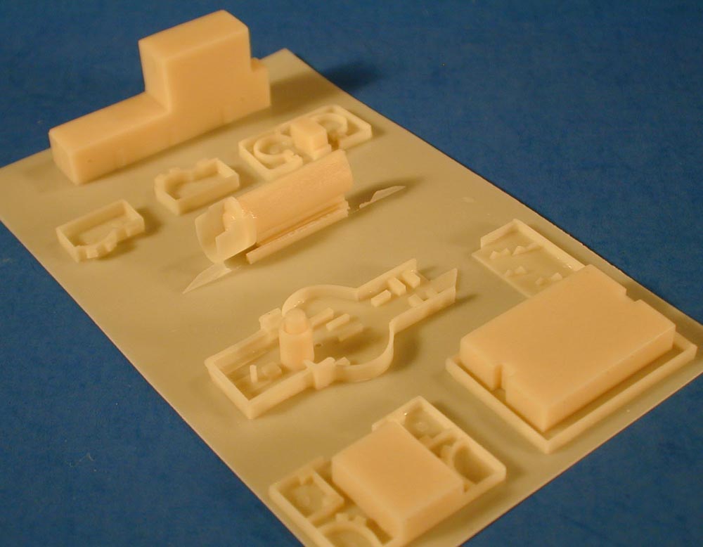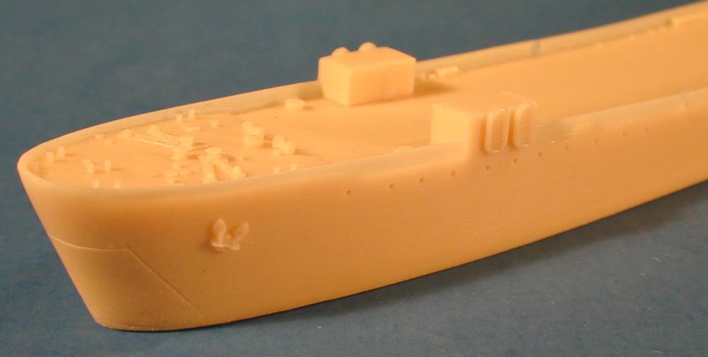 | These parts are cast on thin resin wafers and are fairly well cast. The superstructure parts are pretty good, but don't have a lot of surface detail. This may be correct, but I have no reference to check it against. The ships boats look pretty good, but I am not impressed by the Skywave style machine guns. . | ![]() |
