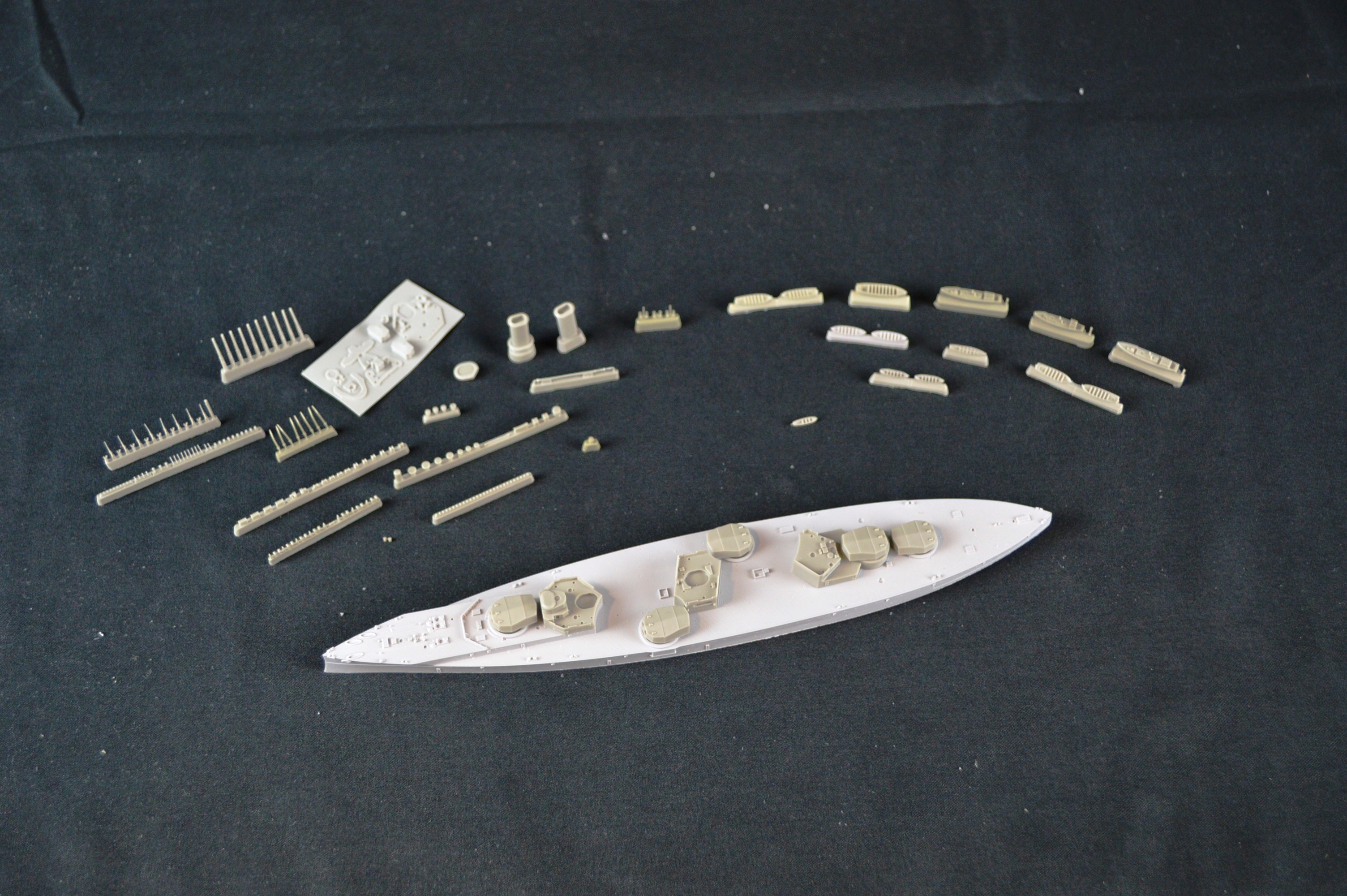 | There are three main parts to the superstructure - forward, center and aft. The latter two drop fit into the hull, while the forward superstructure is attached to the deck just behind A turret. Casting is good, with thin splinter shields and well defined openings for the 4 inch secondary battery. Superstructure platforms and two spotting tops are found on one small wafer, so they will have to be sanded off. | ||||||||||||||