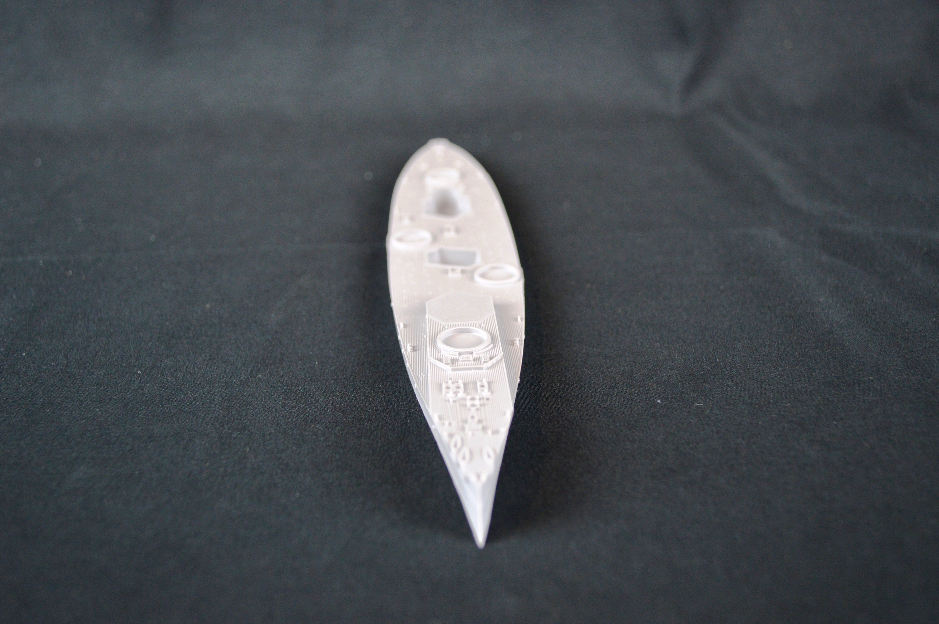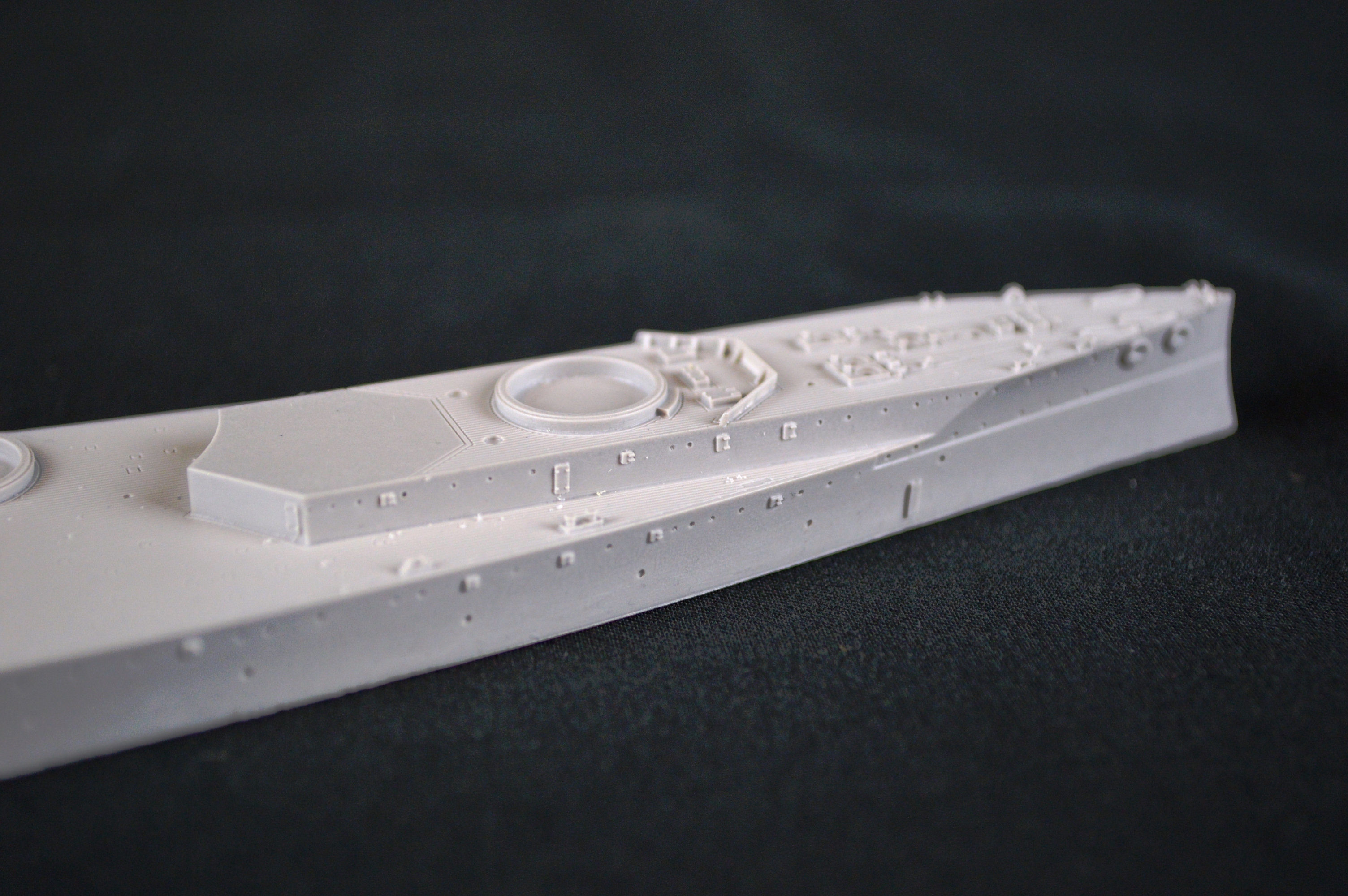 | The hull appears to scale out pretty much perfectly in length and beam. It's sharply cast in light gray resin, with good details. The planking - while there are no butt ends - looks good, as do the subtle coal scuttles. The bollards and chocks are sharply cast, as is the breakwater and anchor handling gear. | ||||||||||||||