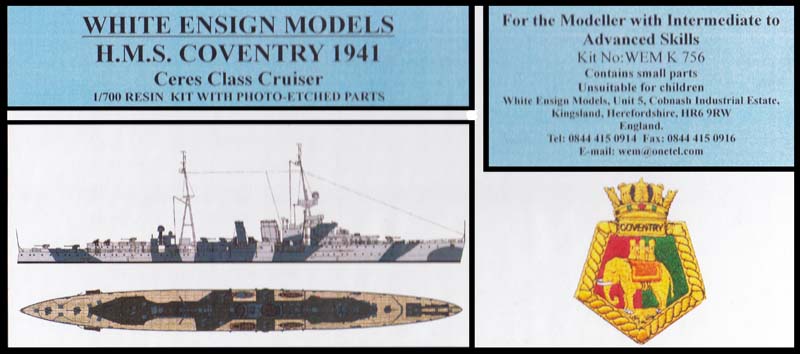 HMS Coventry was laid down on 4th August 1916 at Swan Hunters Shipyard on the Tyne. She was launched on 6th July 1917 being completed on 21st February 1918. Her first year of service was with the 5th Light Cruiser Squadron based in Harwich until 1919 and then she served as flagship of the 1st Light Cruiser Squadron in the Atlantic. After various periods of service in the Atlantic and Mediterranean fleets she was reduced to reserve in 1936. Due to the reductions in numbers of cruisers being allowed by the Washington Treaty, Coventry and her sister Curlew were taken in hand as prototypes for conversion to Anti Aircraft Cruisers. All of her original armament was landed and replaced by ten single 4" MkV mountings together with two 8 barrelled 2 pounder AA mountings. Two HA control positions were also fitted. The after 8 barrelled 2 pounder mounting was removed in 1939 because of a shortage for newer larger ships being built. It was replaced with two quadruple 0.5 inch machine gun mountings that were not so effective. In September 1939, Coventry was serving in the Mediterranean again, but not for long. She was reassigned in early 1940 to serve in the Norwegian campaign. In August 1940 she was back in Gibraltar as part of the formation of Force H before she went on to the eastern Mediterranean and based in Alexandria. During the remainder of 1940 Coventry participated in the attacks on Bengazi and was on escort duty for the Malta convoys. On 13th December 1940 she was torpedoed by an Italian submarine and damaged, but she was not out of commission for long. During 1941, Coventry continued her service escorting the convoys to Malta for the most part and also participating in the covering of the troop convoys to Greece, and their subsequent evacuation. She also covered the evacuation of Crete and the Syrian campaign. In 1942 she was again. employed on convoy duty, escorting supply runs to Malta, but later in September whilst covering the Tobruk raid, Coventry was attacked by aircraft and badly damaged. She was evacuated and finally had to be scuttled by HMS Zulu. History from WEM's instructions White Ensign's kit of HMS Coventry consists of a single waterline hull, three sprues of resin parts, one sheet of photoetch and some random brass and plastic rod. |