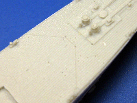 HMS Coventry's waterline hull is well-detailed, with very finely cast splinter shields molded to the deck. The hull is very flat, with no signs of warpage, twists or overpour. The hull sides have a fantastic armor belt with some very finely etched lines, but the hull is marred with many pinholes and both hull and armor belt have a texture from the mold release applied to the original 3D printed master. Great care will need to be exercised to clean up the pinholes without destroying the incredibly fine details on the outer hull. The deck has regular planking detail applied along its length, with recesses for the placement of the superstructure. The fo'c'sle has hawse holes, anchor chain plates, windlasses and wildcats. The bow has molded on anchors, but WEM has also included a photoetch replacement option. The deck edges are detailed with bollards and open chocks, and the hull features a deck-edge ledge for attaching the railing. |