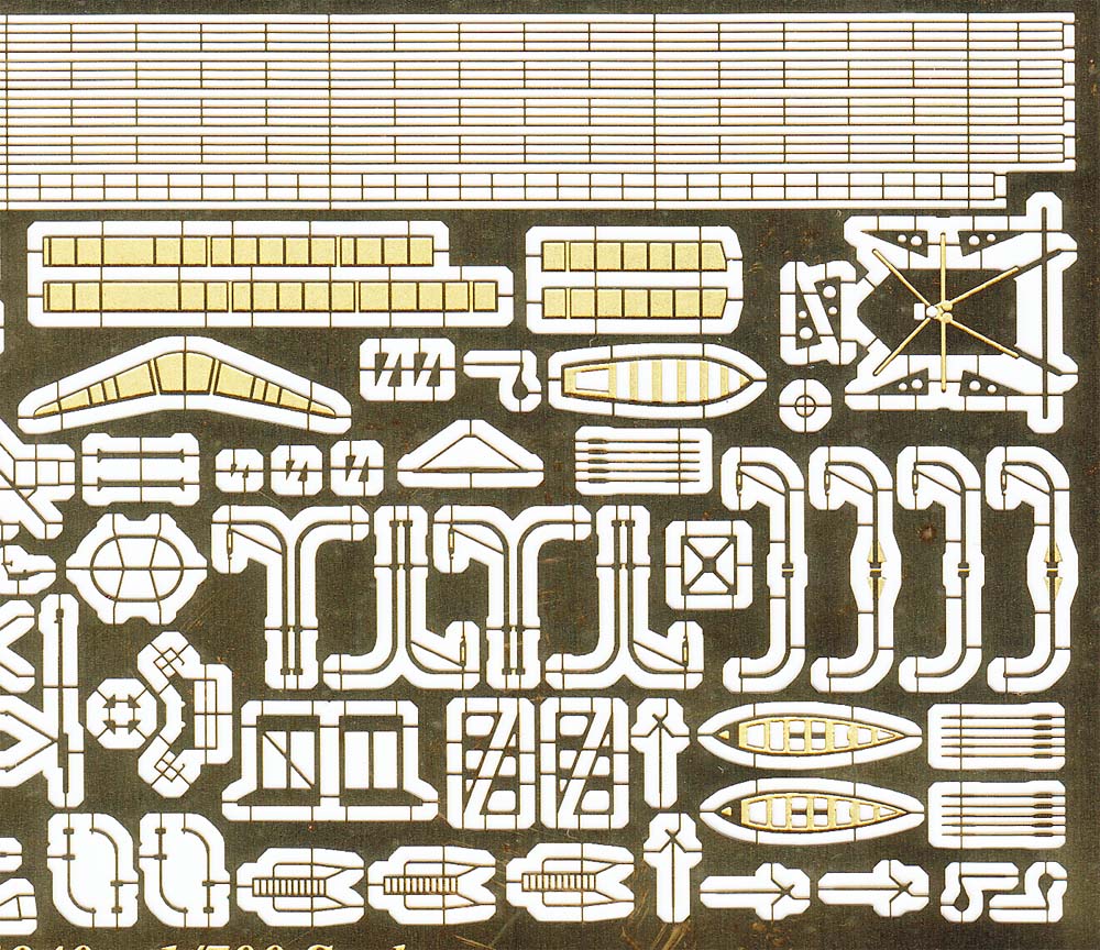 The included relief-etched fret is made thin brass, with WEM's usual talent and skill. This brass fret features many relief-etched parts, including the replacement 0.5" quad machine guns, 8-barreled Pom Pom's, and anchors. |