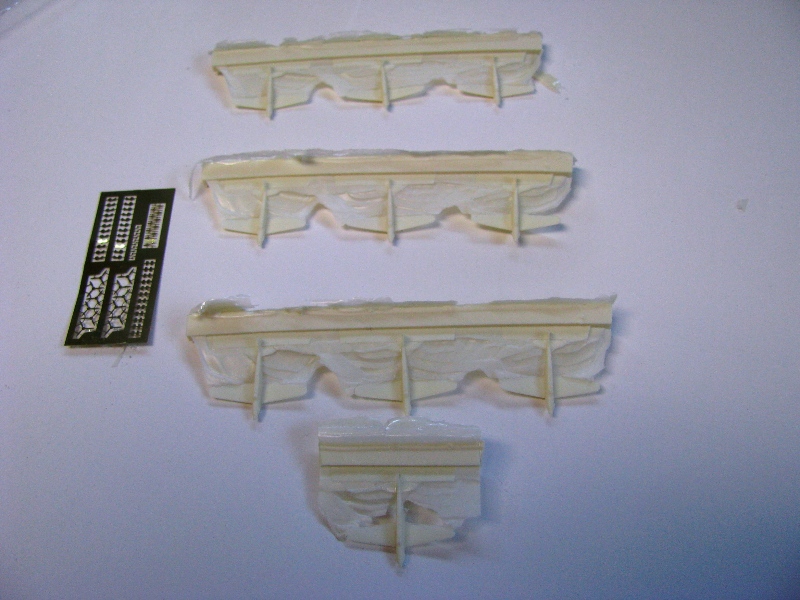 | One photo-etched set is included with the kit, with parts for handrails, ladders, stairways, funnel grills, cranes, antennas, windbreaks, gun sights, and catwalks. The photo-etched is very delicate, with some relief etching. All in all, very nicely done, and it seems pretty complete. | |||||||||||||||||||||||||