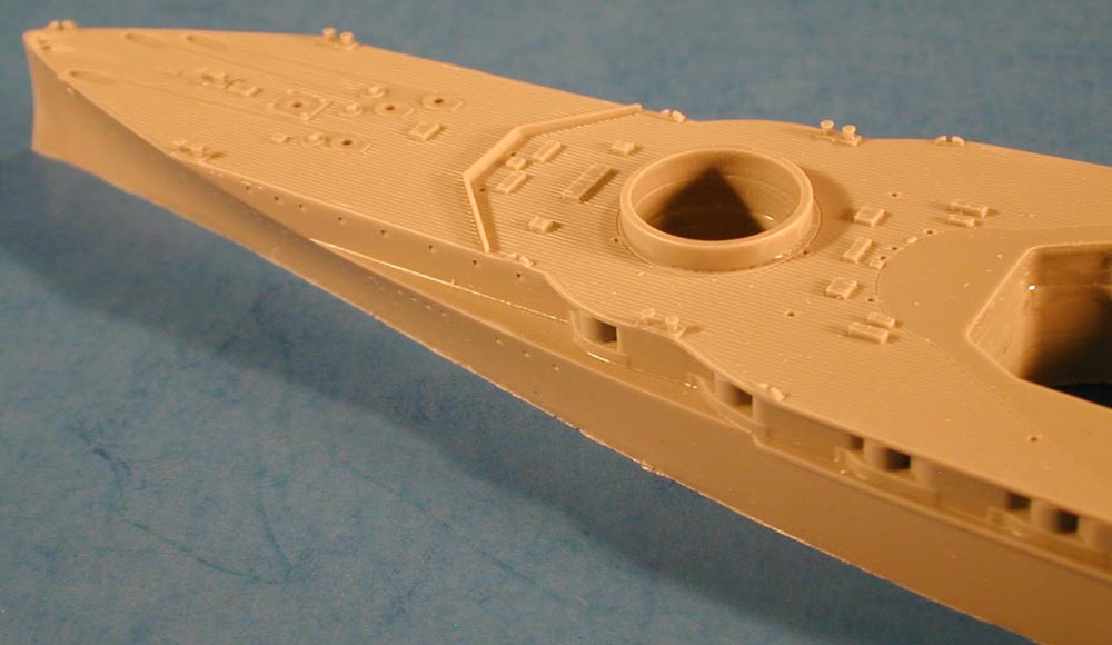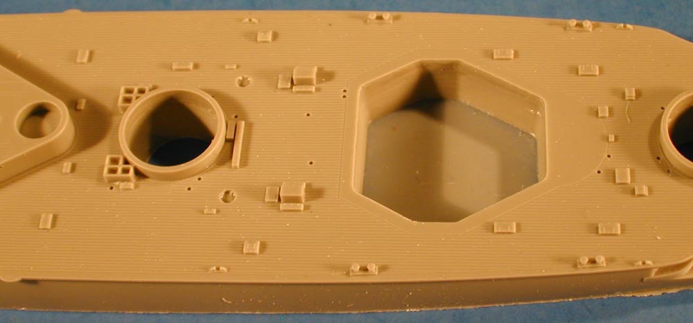 | The hull on this kit is very well done, the casting is very sharp and well defined. The hull has several open areas cast in to reduce the amount of resin that needs to be poured. These hole serve as mounting locations for the main guns and superstructure. Planking is well done on the deck as is the overall level of detail. The capstans are separate parts and the anchor chain is left off. Photo etch chain is provided below. |