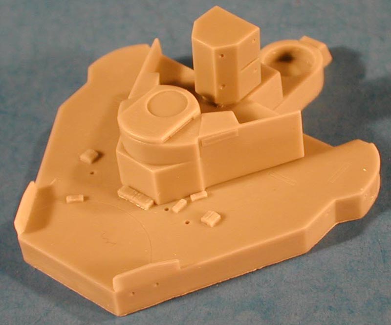 | Superstructure parts are also nicely cast. Some are molded on a thin resin wafer and will need a little flat sanding to free them. The splinter shields are thin and there is plenty of nice surface detail. Some parts are cast on a thin wafer, but other parts of the superstructure are poured with a flat base and a locator plug that fits snugly into their companion parts. Note the last image with the superstructure parts dry fitted. | ![]() |