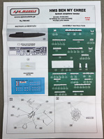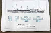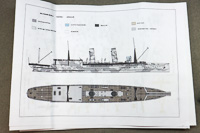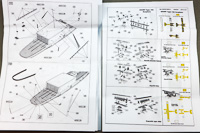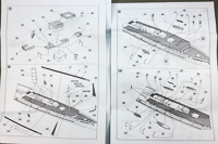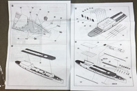 One sheet of the instructions is devoted to the air group. The parts required for each of the four types of planes are indicated, assembly steps, painting guide, and decal placement all shown clearly. The final two pages of the instructions are the paint guide, drawn larger than scale, showing port and starboard profiles, and an overhead plan. All four vertical sides of the bridge are also shown separately, to better illustrate the unique blue and white camouflage Ben-my-Chree carried. Paint recommendations are given in Lifecolor product numbers. |
