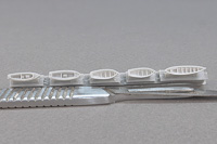 The ship's boats make up two other casting gates. The attachment between the boats' hulls and gate are quite fine, as two boats had broken free in my sample, but there was no damage at all. All boats show smooth hulls, and sharp detail on interior seats. |