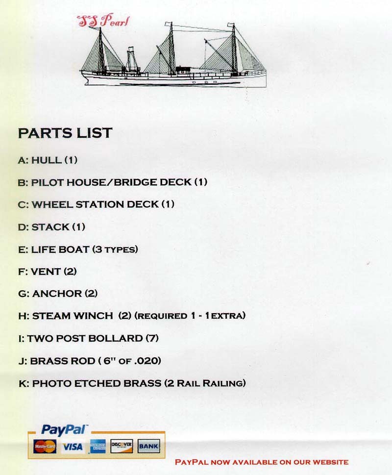 | A couple of lengths of brass railings and 6" of .020 brass rod for the mast are provided. | |||||||||||||