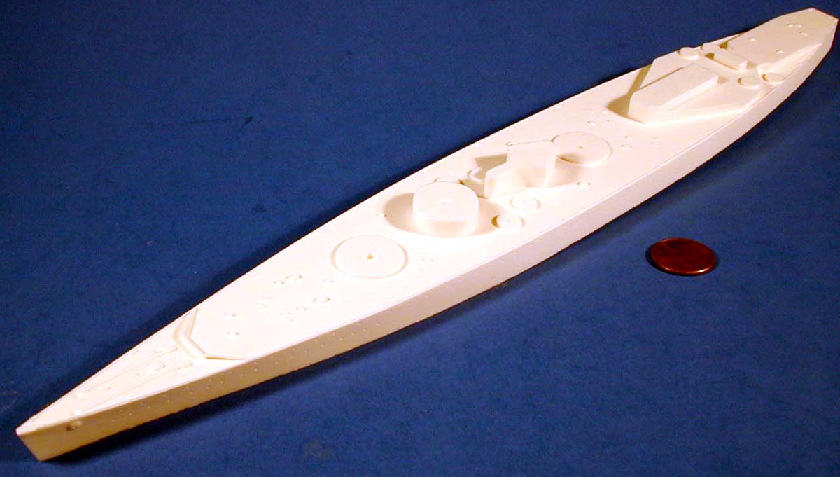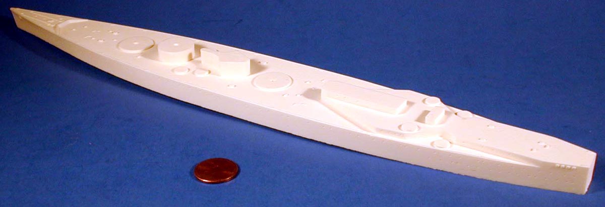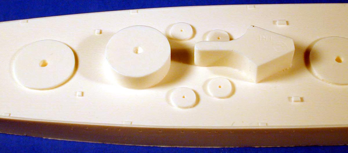 | The hull is cleanly cast with no defects. Deck planking is good and the anchorways are cast clean so you can add the included chain for a more realistic effect. One nice touch is the scribed location mark for the funnel placement. | Click images