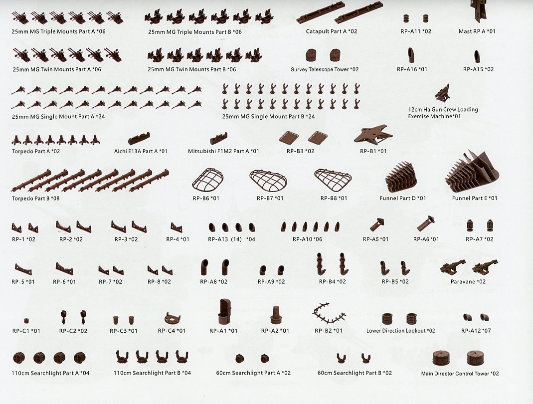 | Almost everything in the deluxe edition is the same as Takao, except that there are 15 3D print rafts (basic and deluxe) in Atago, compared to 12 in Takao. The number of photo-etch frets and turned brass appears to be identical. | ||||||||||