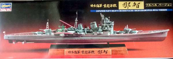 | This is the Hasegawa My?k? class kit portraying the IJN Nachi Heavy Cruiser in I believe a late war fit. My review sample is the limited edition full hull version which appears to be a reboxing of a first release kit supplemented with new parts. First impressions of the kit are very good. Upon opening the box you can see several bags of parts made up of several different media. The main bag consists of all the plastic sprues to build the ship itself. In a second bag Hasegawa has provided cast metal propellers, turned brass barrels for the main guns, a photo etch fret, and a supplementary anti-aircraft/boat/aircraft sprue, and a nameplate. Also included is a wood display base and full decals with markings for Nachi and sister ships. | |||||||||||