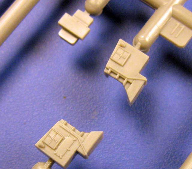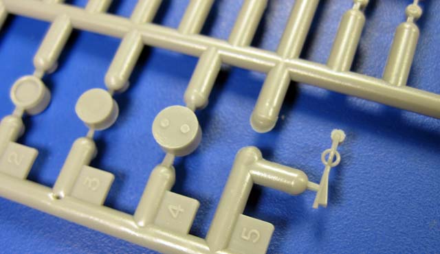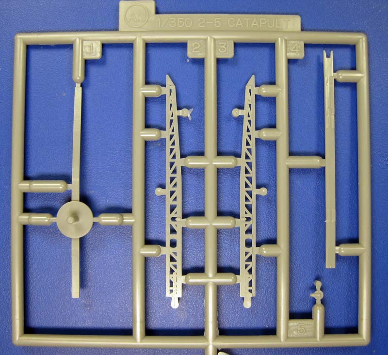 The five parts on the sprue build into the Kure Type No.2 Model 5- however, Noshiro should be equipped with the older, less powerful Type 1 No.2 catapult Model 11. |