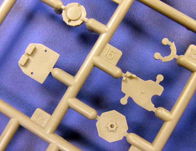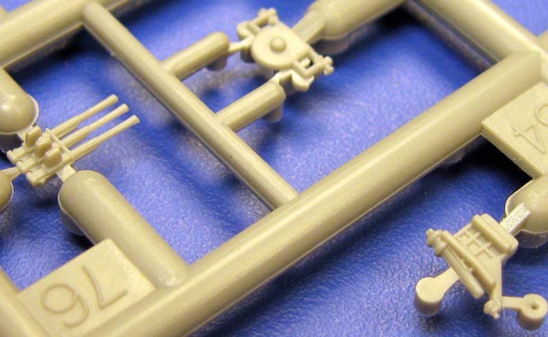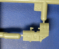 This sprue has two of the Type-41 twin 15.2cm (6"/50) guns- one of each style of gunhouse (with and without Type 14 6-meter rangefinder) and parts to assemble one Type 98 twin 8cm (3"/60) high angle gun. The gunhouses are actually labelled as sub-sprues, and are different from each others. The 15.2cm barrels have both bagged and non-bagged versions; both barrel types have drilled muzzles, albeit with thick-walls to the barrels. These could be opened fairly easily. Each pair barrels is in a right-hand and left-hand orientation to insure proper mounting- don't' mix them up, or they will not fit properly. |