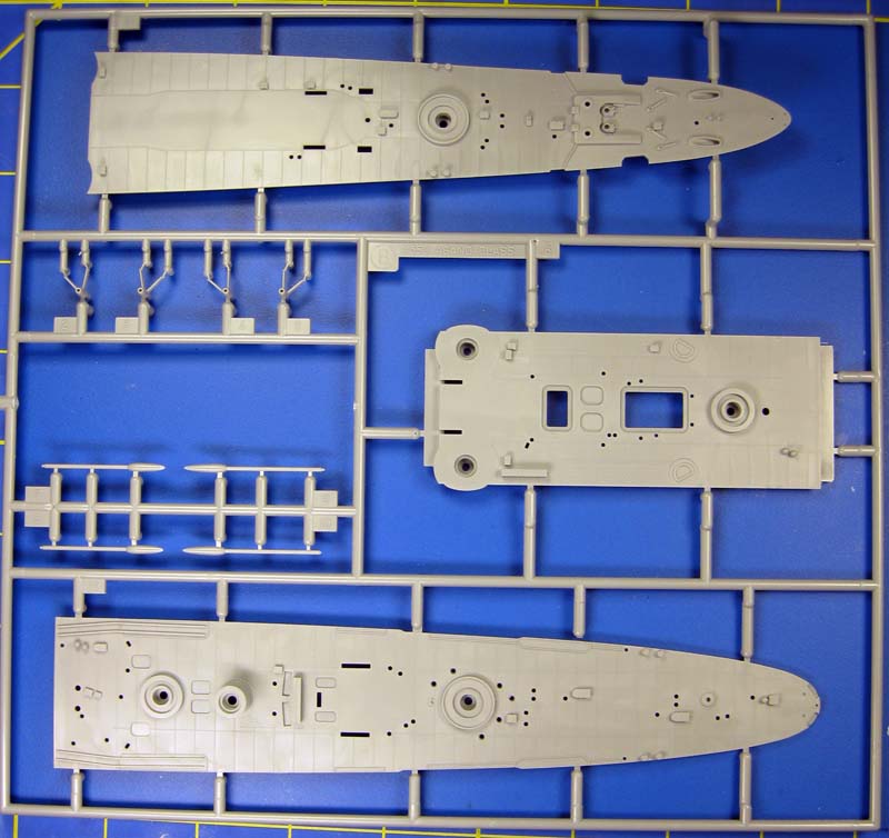 Sprue B has the main decks of the kit, broken into three sections. This sprue also has the prop shafts with skegs, and separate shaft bearings with struts also present. The decks have a textured bow, and raised lines to simulating the Linoleum deck covering. There are a few details, like bollards and hatches molded on, with holes in the deck to place mushroom vents, cable and hose reels, as well as other deck "clutter." |