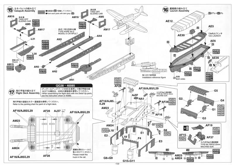 This sprue combination has the Type-92 quad torpedo tubes, as well as an additional ship's launch, Type-94 high angle gun directors and other various fittings like davits, winches, etc. One particularly nice part is AJ9; this is a jig to assemble and align the telescope "ears" to the Type 95 Machine Gun Fire Control (see page 6 of the instructions.) Another great detail is not only are the torpedo tubes and weather housing here, but the torpedo reload storage it finely detailed- but also includes two "Long Lance" Type 93 torpedoes! |