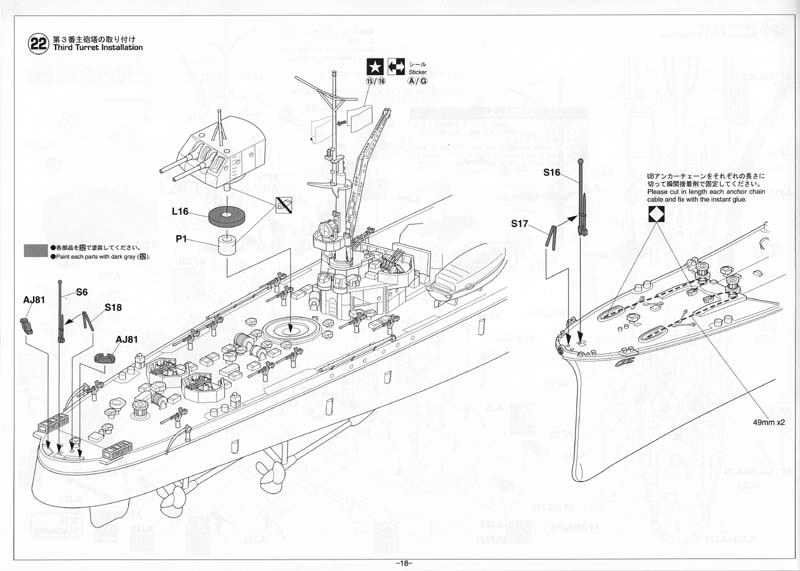 A 20 page instruction book is included, There is also a full 1/350 scale poster with a painting guide, with a rigging diagram on the reverse. The instructions are quite good, and laid out in a simple, logical style. When assembly order influences parts fit, there are directions indicating this. Hasegawa has also started to identify parts by actual names and designations in the instructions, which is a great learning tool. Please see page 6 of the instructions for the unique alignment jig used to assemble the Type 95 Machine gun fire control director. |