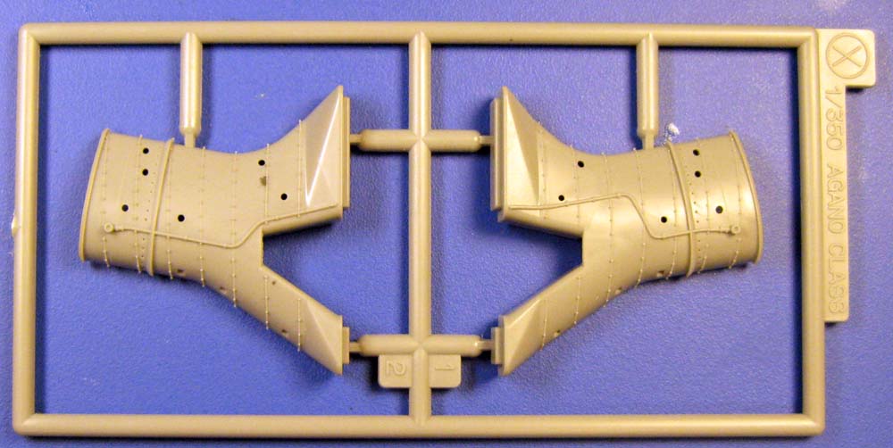 Sprue X has the classic IJN bifurcated stack. The two-piece stack is well detailed, with hand holds molded on and openings to mount the external lines from sprue S. |