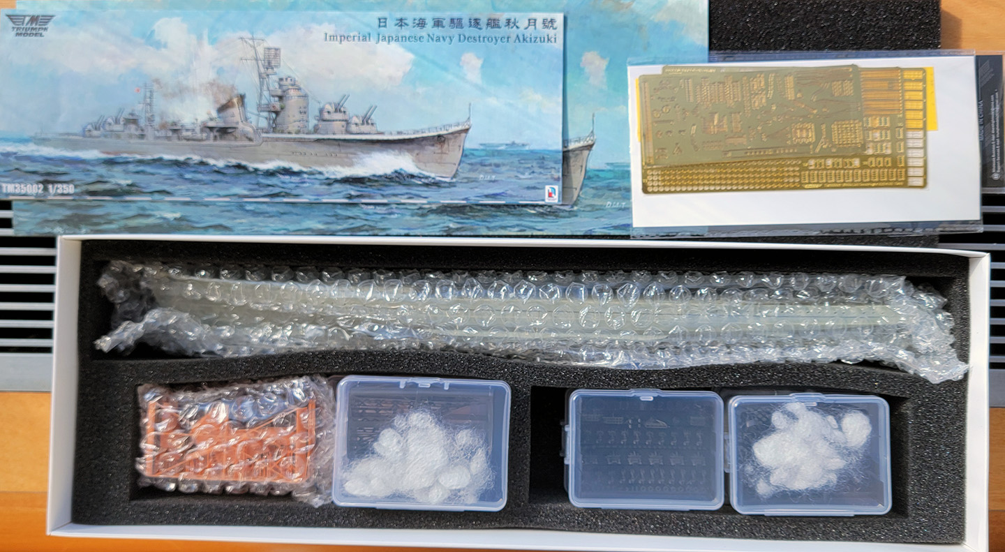 Triumph has simplified its offerings as compared to its recently released Mutsuki kit. Whereas that kit offered four options: waterline or full hull, standard or deluxe, the Akizuki kit comes only as a waterline or full hull kit. A deluxe upgrade package containing three sheets of photo etch parts, turned brass barrels, and a deck mask for painting is available for separate purchase and can be used with either version. This review kit consists of the standard full hull kit and the deluxe upgrade package. The kit hull is cast a very light grey resin. Everything else in the standard kit is a 3D printed part. The basic kit also comes with brass rods for masts and prop shafts (for the full hull version), plus flag decals. There are thirty-two print rafts; numerous smaller parts are contained on twenty-four rafts printed in black while four larger rafts containing superstructural items are printed in orange. Oddly, one of the smaller parts is printed in orange. Also included is a 3D printed nameplate. The kit art and contents are appropriate for Akizuki, late 1944. This same configuration would also be appropriate for sisters Hatsuzuki, Wakatsuki and Shimotsuki in 1944, excepting some placements of the single 25mm AA mounts. |