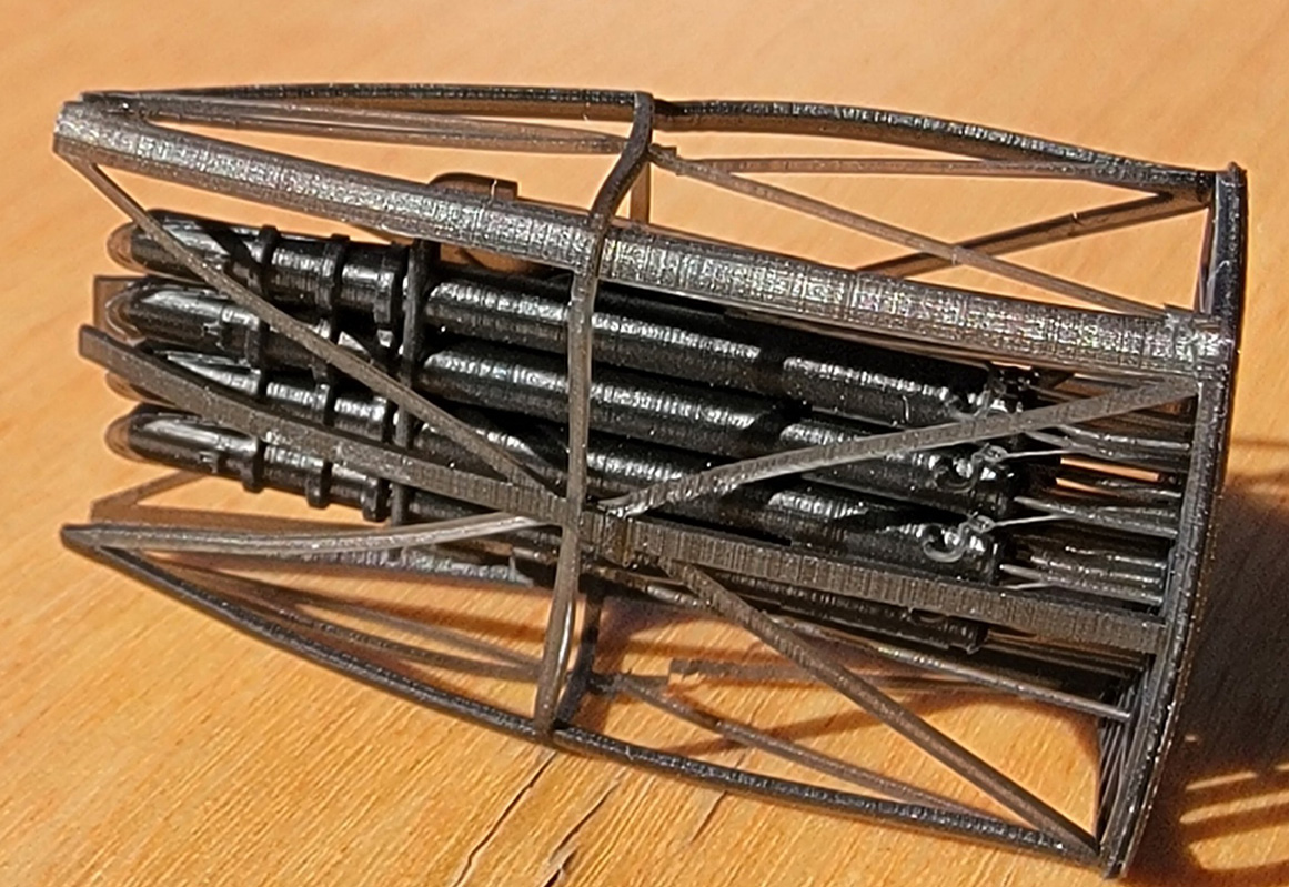 ·A – bollards, bow and stern fairleads, two hawsepipe covers with handwheel brakes ·B – several sizes of deck hatches, a large bitt, and small mushroom deck vents ·C – capstan and handbrake wheel, ammo boxes, torpedo handling davit, deck winch ·D – Depth charges, bumpers in cages, hawser reels. ·E – holds 3D printed main barrels, 90cm searchlight, one 9m motor launch and a large gooseneck intake. The marketing photos show this raft printed in black. I don’t know why it’s been printed in orange here. ·F – Sleeves for 10cm barrels, torpedo trolley, deck vents, gooseneck vent ·G - binoculars, 3m rangefinder, 13mmm MG ·H – deck hatches, boat cradles, bridge antenna base, speaking tubes, gooseneck vents, support for galley pipe, small access ladder, helm and compass binnacle, searchlight director, RDF antenna ·I – life rings, fairleads, small reels, 25mm AA ammo boxes ·J – fore and aft jackstaffs, antenna tripod, davits (boat, torpedo & depth charge loading), aux, generator exhaust pipes ·K – wave break fairing, propeller guards, torpedo reload gantry vertical support, Y-guns, engine room hatches, bullnose, anchors ·L - depth charge racks, Type 21 radar and extra base, gooseneck air intakes, vegetable locker ·M – triple 25mm AA mounts ·N – single 25mm AA with small and large round bases ·N2 - single 25mm AA with large round bases ·O - compass bridge deck extension plus component sections and braces for the foremast, plus more anchors. These components require lengths of brass rod for the legs of the mast and assembly is covered only in the deluxe upgrade instructions. Otherwise, see raft Z14 below. · Q - anchors, rudder, props, prop shaft brackets ·R – Two types of deck hatches, I think. However, the instructions do not list any hatches from a raft labeled “R”, only “H”. Possible erroneous lettering. ·Z3 – roof for bridge, with integrated wind vanes. ·Z4 – base for Type 94 High Angle director atop the bridge ·Z5 – Type 94 High Angle director (main gun director) ·Z8 – 25mm AA platforms for both sides of funnel ·Z9 – central 25mm AA bandstand and RDF/searchlight platform with integrated vents and RDF compartment ·Z10 – enclosed 10cm main battery turrets (four) ·Z11- Type 92 mod 4 torpedo tube mount shield (one) ·Z12 – quadruple Type 92 torpedo tube mount (one) ·Z13 – one piece printed main mast with Type 22 radar attached (hard to see inside its raft) ·Z14 – one piece printed foremast (also hard to see inside its raft) ·Z15 – overhead torpedo reload gantry girder (paired with a vertical support on raft K) Surprisingly, no printed anchor chain is included with the kit, unlike the previous Mutsuki kit. So, the modeler will need to obtain some chain. |