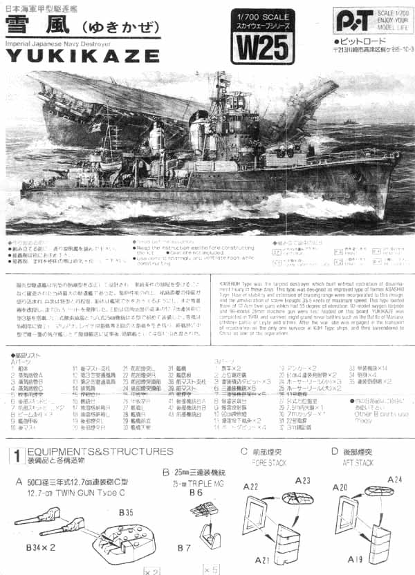 This kit is one of the best Japanese waterline ship kits available today. It is highly detailed and is a vast improvement over the other waterline destroyer kits originally produced in this scale. It can be built out of the box with good results. But add a some PE rails and rigging and you have a real nice representation of one of Japan's best class of destroyers. This is kit #W24 and has a current retail of $27.50 US. |