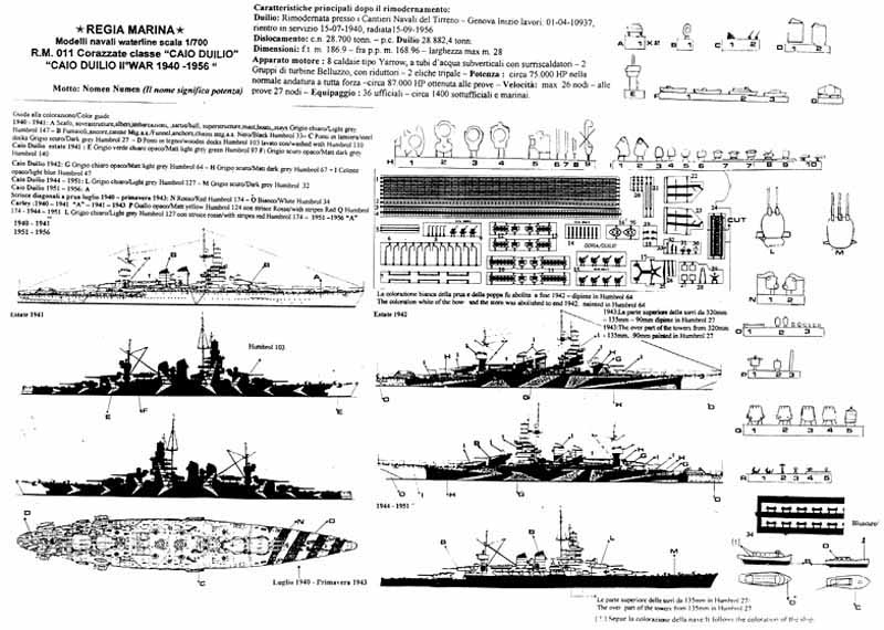 The Italian Battleship Caio Duilio and sister ship Andrea Doria were originally built in World War One. They had an impressive armament but sacrificed armor protection. They saw no action in that war and were extensively rebuilt just before the Second World War. They gained over 30 feet in length, went from coal fired to oil fired and increased top speed from 21 to 27 knots. Both ships were active in the Mediterranean were they were used to attack British convoys. Both ships were used unsuccessfully against the British Force H, though there presence in that theater tied up many valuable Allied ships that could have otherwise been used elsewhere. |