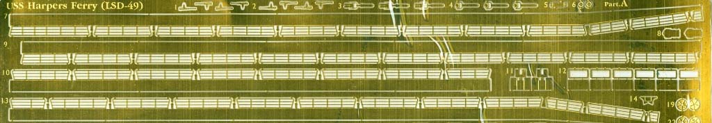 | There is eight separate photo-etch sheets in this kit. four of them being very comprehensive and covering just about everything one could ask for in a good quality kit. Enough watertight doors are included for either open or closed position. Railing for all decks, all levels and platforms are included. There is relief etching on all sheets. They even supply the well deck catwalk platform railings. All radar screens and mast platform supports along with inclined ladders of all sizes for every deck. Upon reviewing the photo-etch i can't find anything that has been left out. Each part is numbered so there is no question what goes where. All sheet are packed well and nothing is bent or broken. | ||||||||||||||||||||||||||