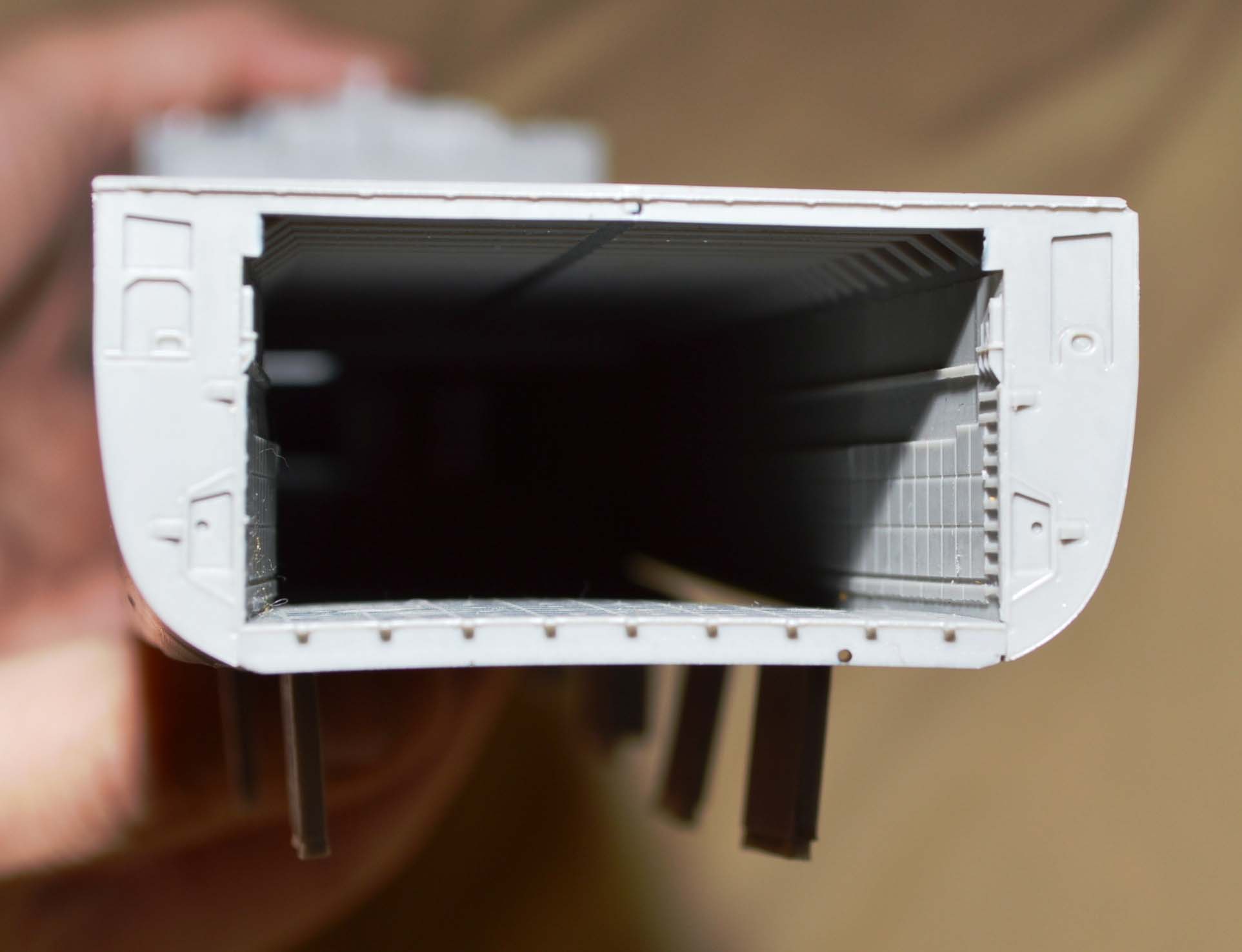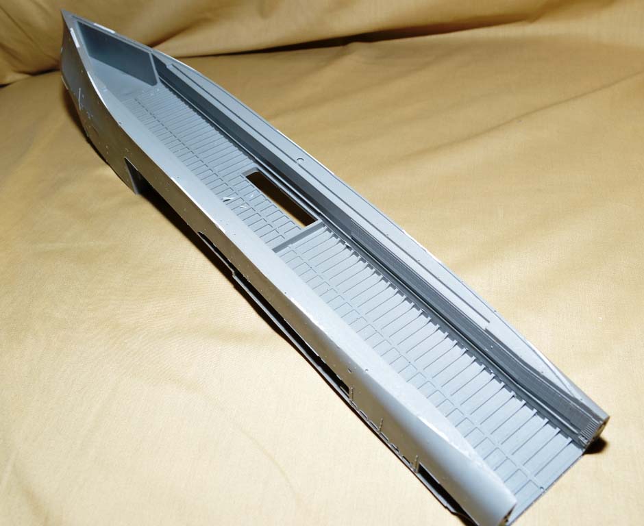 | After looking over the four ships in the class I noticed they all have a small section under the flight deck, all the way aft, on both sides of the hull that is open to the interior of the well deck. The kit does not have this opening but rather that area is closed off from the inside of the well deck. However it can be opened with a Dremel or another drill type tool and some small files. I believe this area was left enclosed on the kit to make the hull removal from the mold possible. | ||||||||||||||||||||||||||