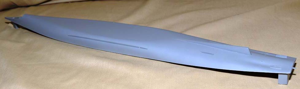 | The Lower Hull section is cast as one piece. The lower bow of this class of LSD has a large bulb. Orange Hobby cast the bulb as a seperate piece which makes it easier to remove the hull from the mold and also to preserves the life of the mold. It has the locating slots for the bilge keels and holes for the shafts, struts and rudders. Overall it is a nice casting but I did find mine to have a hog in it running the length of the hull with a slight twist at the stern. Nothing a few minutes in the oven won't fix. That's is a whole other story. | ||||||||||||||||||||||||||