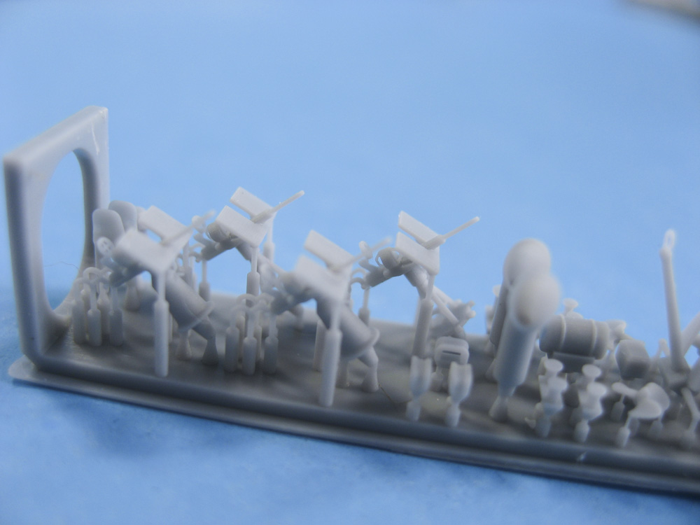 | The remainder of the kit's resin are made up of 3D printed parts. These are extremely fine, and have to be seen to be believed. I've been working in CAD design and printing for a few years now, using SLA, DLP and CLIP based liquid resin printers, and I've never seen anything like these Black Cat Models parts. The 20mm barrels are .010" in diameter, and the vent cowls are so thin as to be translucent. There are also no layer lines at all, so finish sanding won't be an issue. The only issue is that most of the smallest parts, such as the 20mm guns, ventilators, chocks, etc. are cast on a single, small wafer, which may make removal tricky. The print supports are very thin, though, so it shouldn't be an issue to get a blade in there to cut them free. The only real issue I see with the quality of the parts is on the two M4 Sherman turrets, which have a bit of warpage on the gun barrels. |
