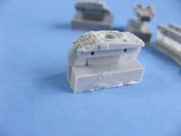 The remainder of the cast resin pieces are for the M4 Sherman tanks, and the M7 Priest mobile howitzers. There are 4 Priest hulls and 2 Sherman hulls. Each comes with two sets of treads for each hull, which are slightly different between the two chassis, so take care to match up the right ones (the instructions point them out). All of these small pieces are on easily-removed casting blocks, and are as finely detailed as the ship's parts. I do have several small pin-holes in the tread castings, but all of those are on the tops, which will be covered by the chassis skirts, so they won't be an issue. |