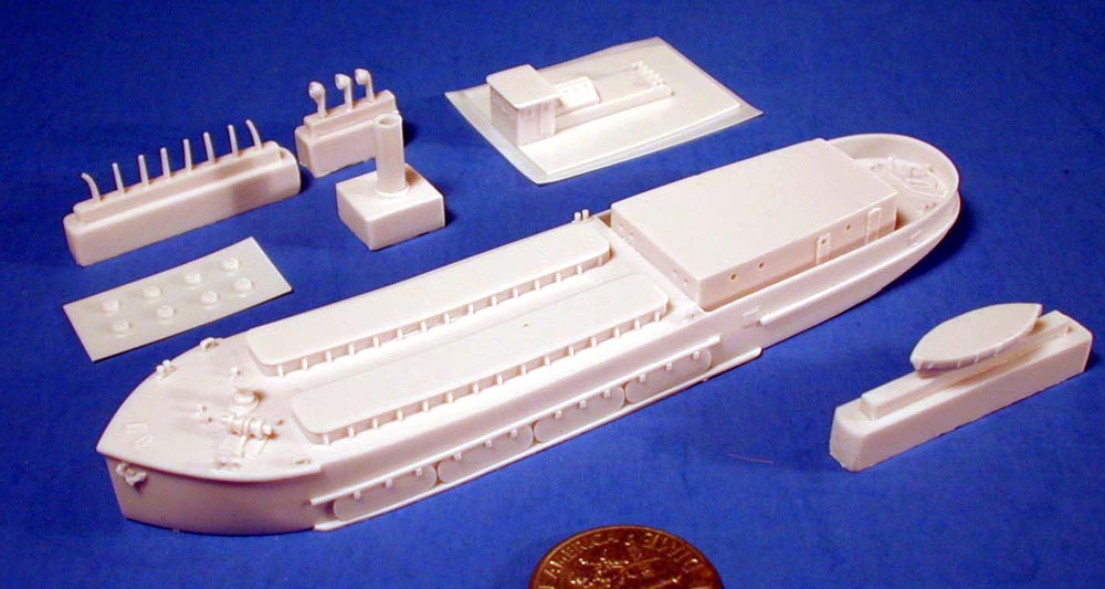 | The hull on this kit is very well cast and features some really sharp detailing for such a simple ship. There is a nice deck winch on the bow that looks like it could actually work. The discharge doors on the sides look pretty good and include hinge details. Bits, capstan, and other deck details are all nicely cast. There was a little flash along the waterline when I opened the kit, but it was so thin that it fell away as I handled the part. | Click images