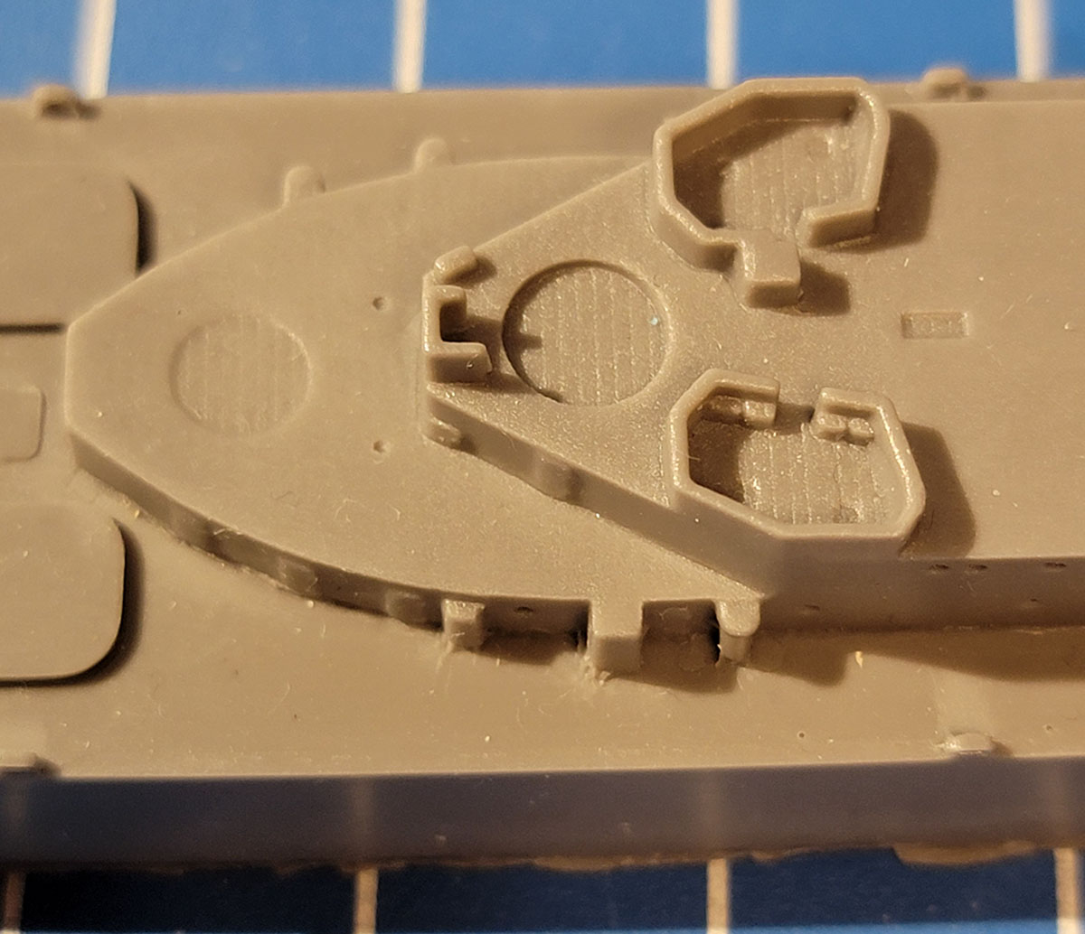 | The 452 foot hull works out at 197mm in 1/700 and that is the exact measurement of the kit hull. The beam is also spot on. It is very sharply cast in a dark gray resin with no twisting. There are some bubble holes in the underside but won’t affect the build. Planking detail on the deck is very crisp though with no butt ends; bollards and capstans are molded on as well as hull side details. | |||||||||||||||