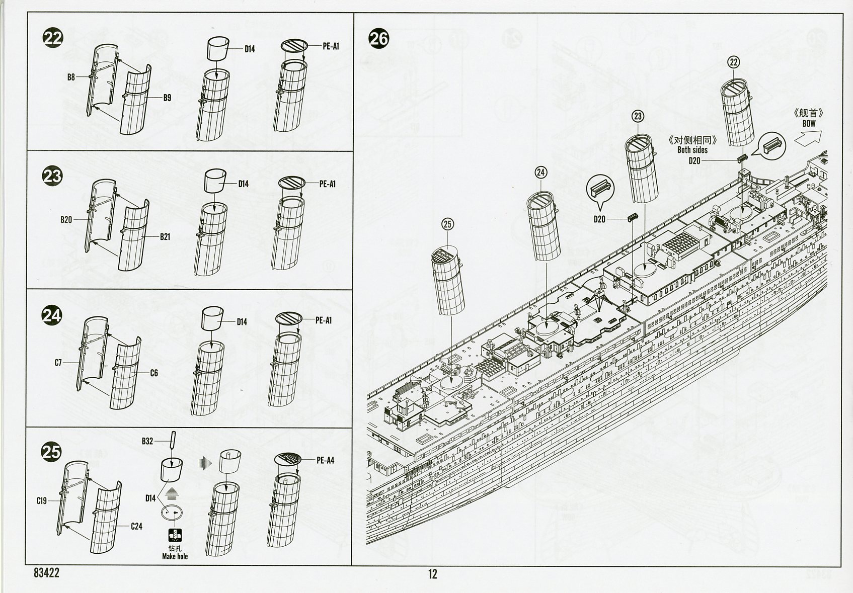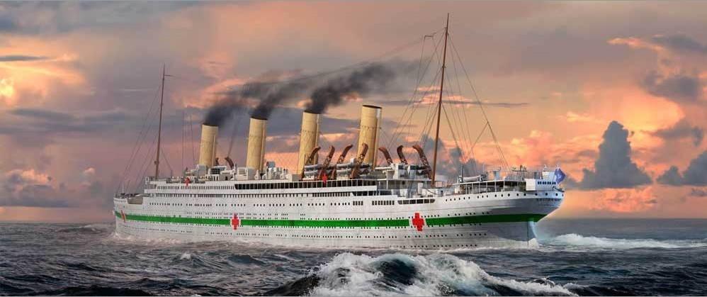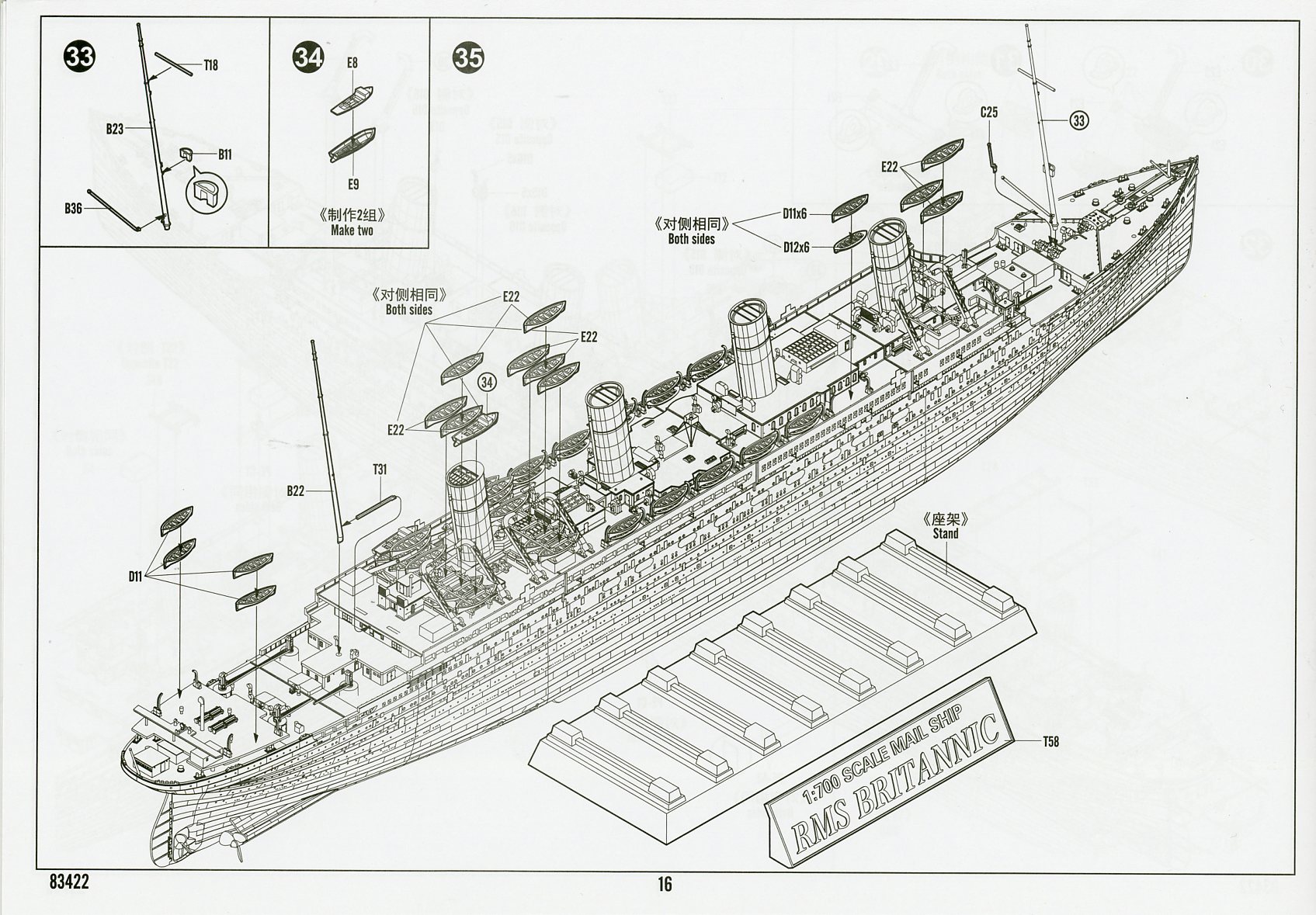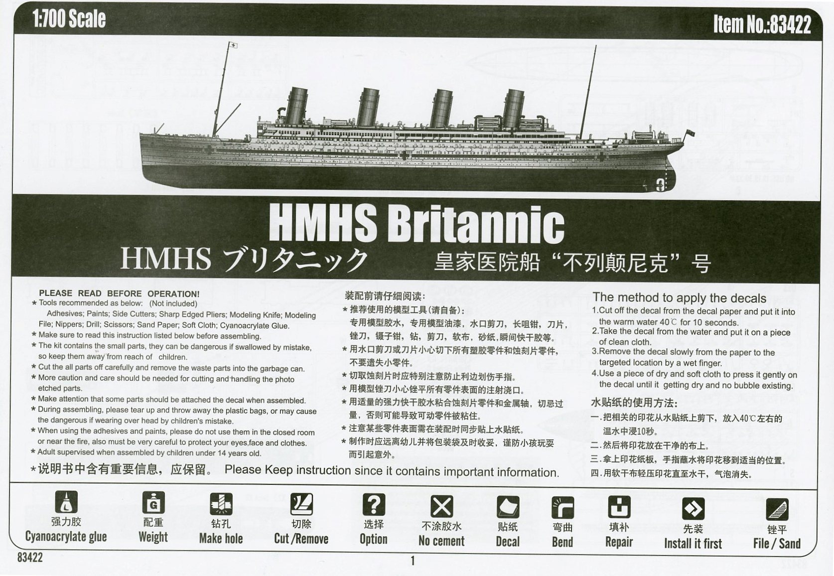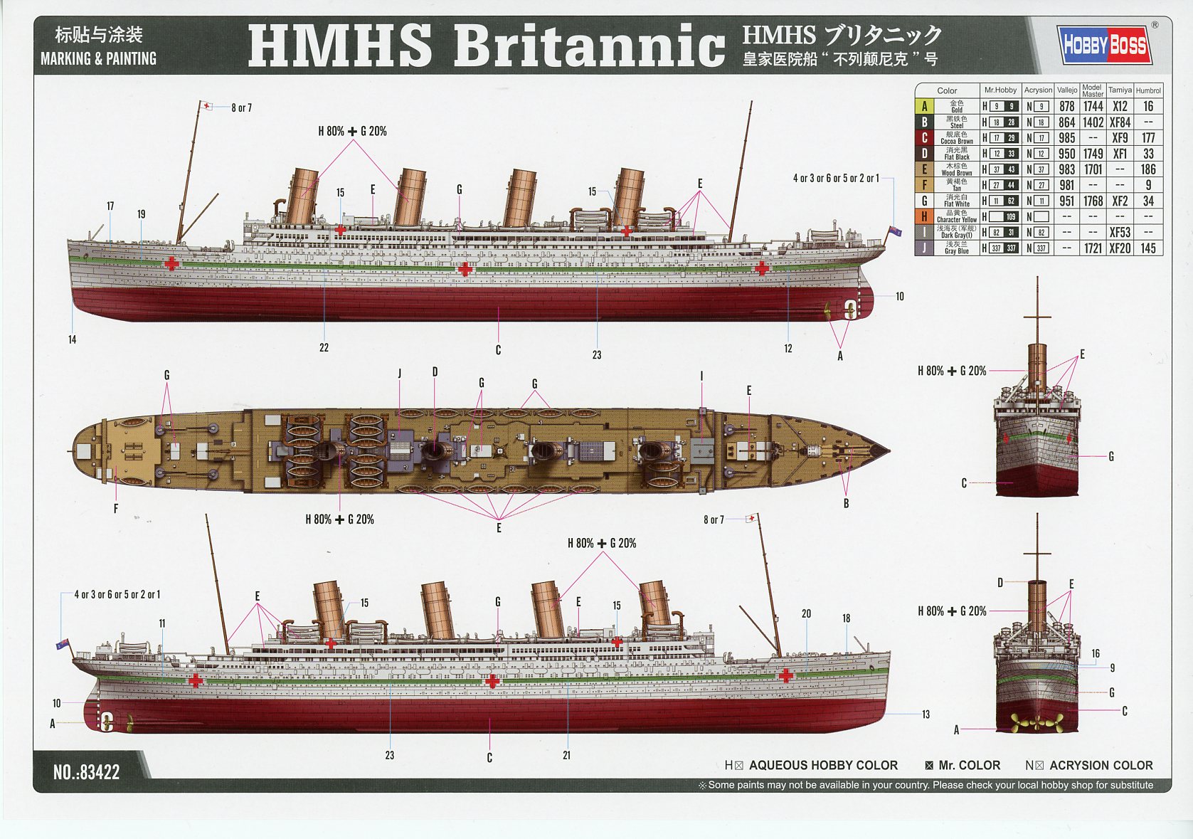The Hobby Boss Britannic The Hobby Boss 1/700 HMS Britannic comes is a sturdy cardboard box. On the box top is a painting of Britannic at sea. The model is supposed to represent Britannic as a hospital ship, wearing overall white with red crosses and bold green lines on her hull. Inside the box are 21 sprues, a stand, two small photo-etch frets, and decals. Many of the sprues are marked "Titanic", while ten others are specific to this version of Britannic, and marked as such. This kit shares the following spures with the previously reviewed HMT Olympic kit: