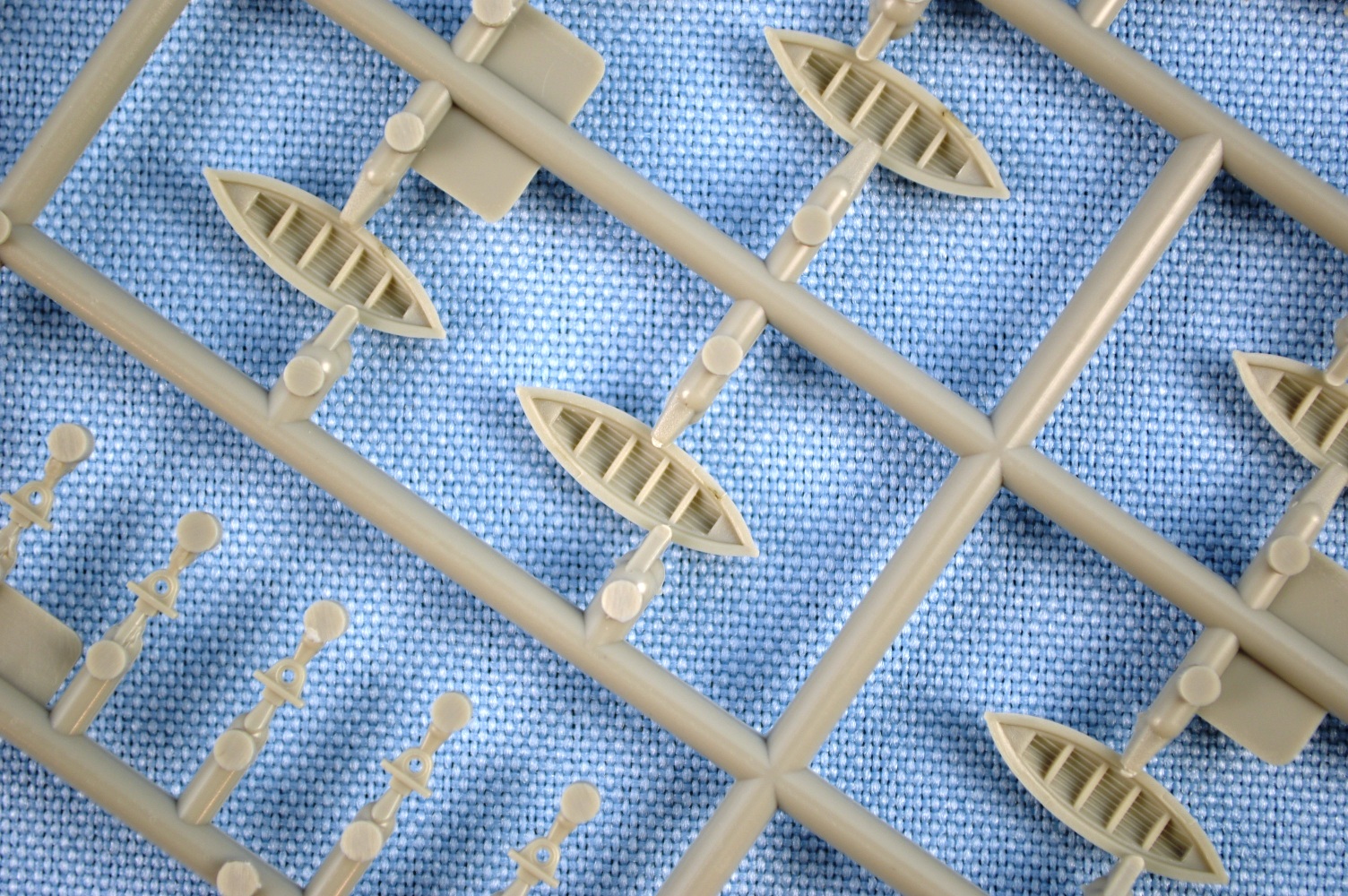 This sprue lifeboats, the large, unique gantries that Britannic carries, and the padeyes that attach the gantries to the deck. Boat detail is good, with planking in the bottom of the boats. However, the gantries are pedestrian, and would have been better rendered as photo-etch (luckily, Toms Modelworks makes a set that includes these). |