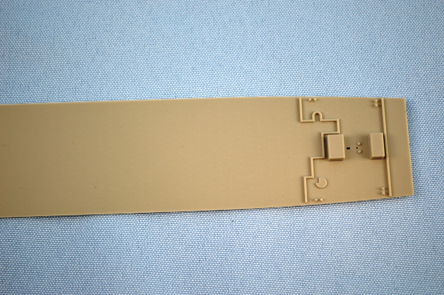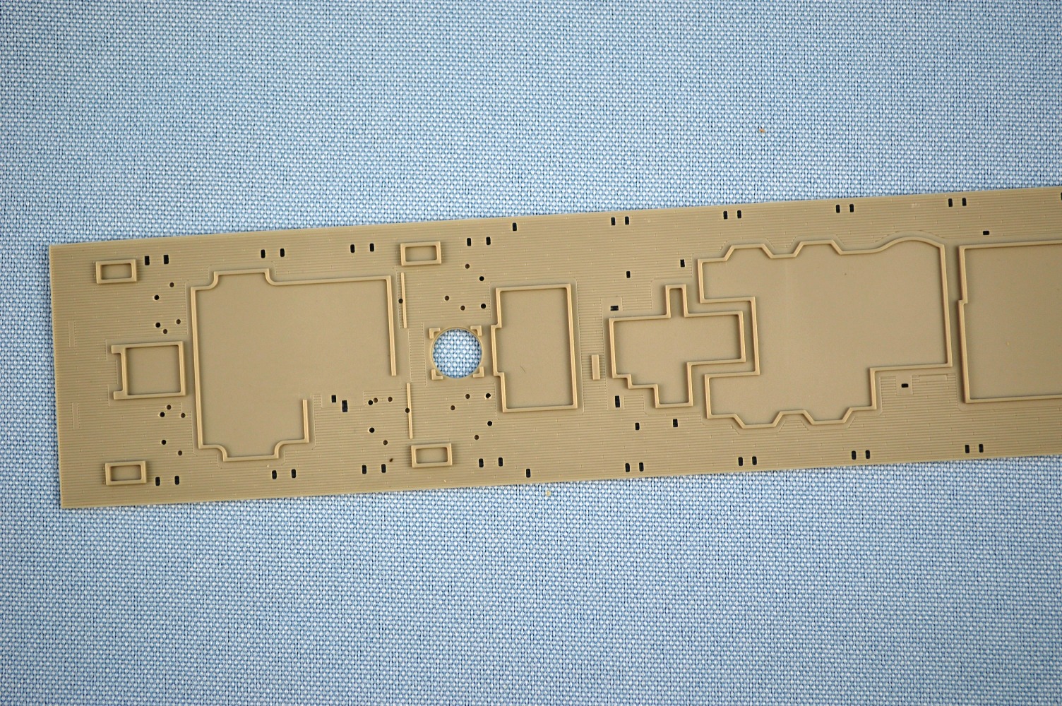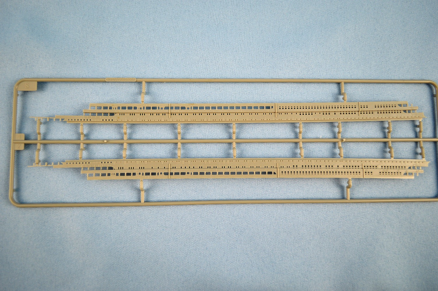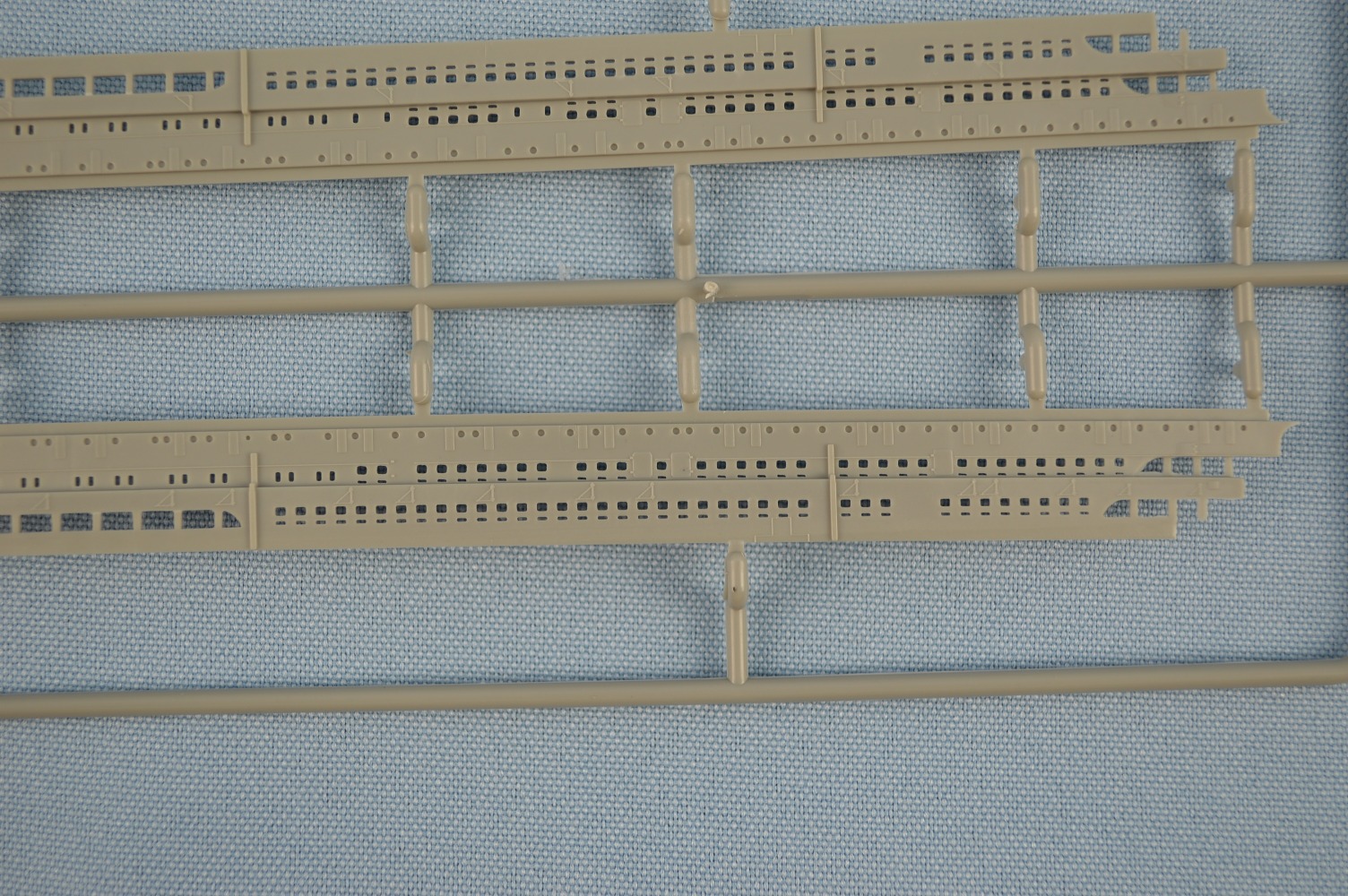 | This sprue contains the sides of the promenade deck. Similar to the previous releases, this sprue is unique to this kit, which was a smart way to engineer the differences between the sisters. There is some nice detail on the sides of the deck, though super detailers might want to remove the molded on davits and add photo-etch replacements. | ||||||||||