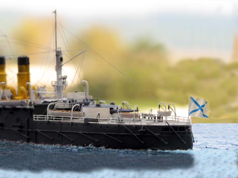 Since the plans in the book included the deck by deck layout of the ship and I like to open the casemates on my models whenever possible I decided to go one step further and actually make the casemates hollow. In order to accomplish that I went with my usual sandwich method for making the hulls and made the lower part of the hull based on the drawing of the casemate deck and then made one more layer for the areas between the casemates. I roughly sanded down the sides to give them the correct shape and then made the hull plating from the 0.01" thick styrene sheet. Before gluing the plating to the sides I cut out the gun ports in it in the correct locations. Then I detailed the casemate with the bare minimum of the items that are supposed to be there, since not too much will be visible in the final product anyway. I didn't go all crazy with detailing but did add the major structures that were there like the smoke stack casings and so on. I then painted the interior of the casemates with while walls and tan decks, added a wash and drybrushed. At this time the mounts for the 6" guns were added without the barrels since the barrels would have interfered with the sanding of the sides of the ship and would be added later. Once the casemate was complete I've made the deck by laminating the ship plans onto the 0.01" styrene and scribing the deck planking. I then glued it to the hull. Once it was attached I sanded the sides of the hull to give them correct shape and filled the problem spots with putty. After smoothing down the sides of the hull it was time to build up the upper casemate. Its sides were made from sheet styrene and the its construction repeated all of the steps that were done on the lower casemate. In retrospect it was probably way too much work to do for negligible results since the gun ports are tiny and not too much is visible through them, but I like it anyway. After the hull was finished, I started adding the details to it. The smokestacks were made from various thicknesses of the brass tubing. I cut them to the correct length and used the Dremel tool as a mini lathe to make various corner cuts and grooves in the stacks. Ventilator heads were taken from the spares box. To further give the appearance of depth to the ship I made the light wells above the machinery rooms open. To do that I made up their sides from the thin styrene. Since I though about it after I closed down the hull I couldn't make them go all the way down to the engine deck so I decided to paint the interior horizontal surfaces black and to give them some 3D feeling I added tome photoetch mesh that I painted white. The round turret barbettes were cut out roughly and turned on the Dremel, since I didn't have an easy way to cut them out straight right away. At this stage various small details like hatches, conning tower, bollards and others were added. The ship was then primed and after fixing minor scratches and pits, the final detailing was done. I've added the photoetch doors, booms for the torpedo nets, anchors and so on. Next came the painting. During it's career the ship carried three different paint schemes - classical Victorian scheme with black hull, white superstructure and yellow stacks from 1896 to 1897, overall white with yellow stacks from 1897 to 1903 and overall black with yellow stacks during the Russo-Japanese War. Each of the periods was preceded by a refit which altered the look of the ship, so you need to choose which one you want to do before you start. Despite my usual preference for the combat schemes I chose the early Victorian one because I really like the way the ship looks with short masts. The painting process went as usual - I painted the deck first, then after masking it off painted the yellow stacks, then white superstructure and finally the black hull. Once the painting and the touchups were done I made the bridge windows using pieces of decals. I did the wash using the stuff called "Black-It-Out". It's a water soluble ink-like stuff that once dry I remove with a Q-tip and a stiff brush. The final step was drybrushing with a lighter shade of the black for the hull and tan for the deck. |