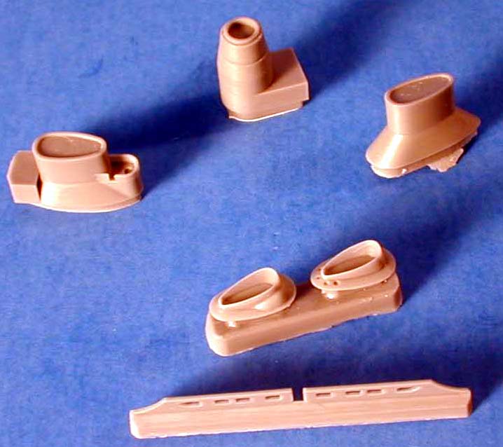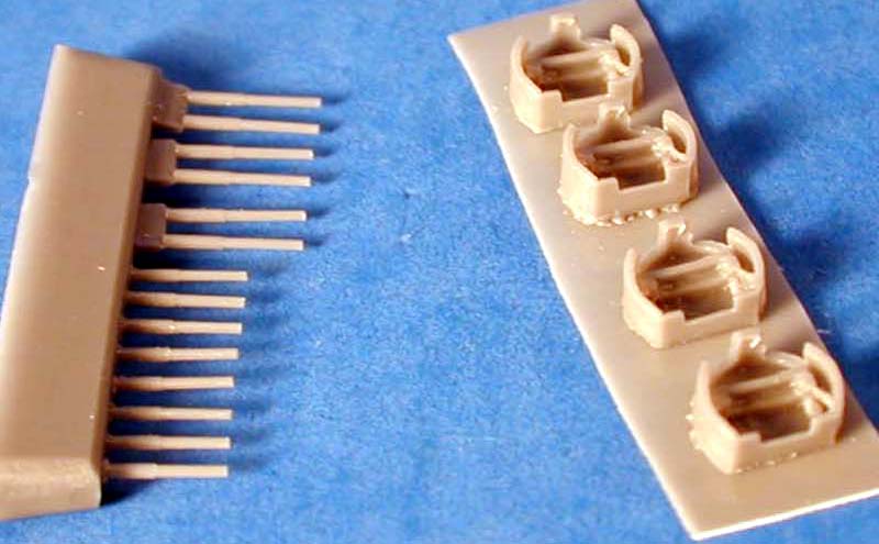 | Most of the superstructure parts are cast on thin resin wafers. The parts are well cast with little flash. One thing that stands out is the way the parts are designed to fit together. In most cases there are properly sized sockets for the corresponding parts to fit into. This will save the builder a ton of time in sanding and getting the fit right. I'm not a big fan of the resin wafer method of casting parts, but Combrig manages to keep the thickness of the wafer to a minimum. | |||||||||||||||||