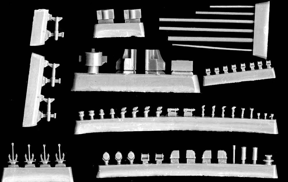 | Some very finely cast fittings are provided for the ships anchors and various cable reels. Paravanes and other fittings are also provided. Mast parts are included, but if you plan to add rigging you will want to use these are templates for brass rod replacements. | ![]() |