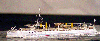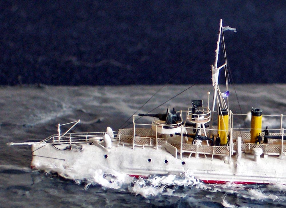 | To allow some of the lower hull to be seen I added a thin piece of styrene sheet and sanded to the appropriate shape. This was then painted anti fouling color, and the hull mounted in a wave pattern of white glue. | ![]() |
